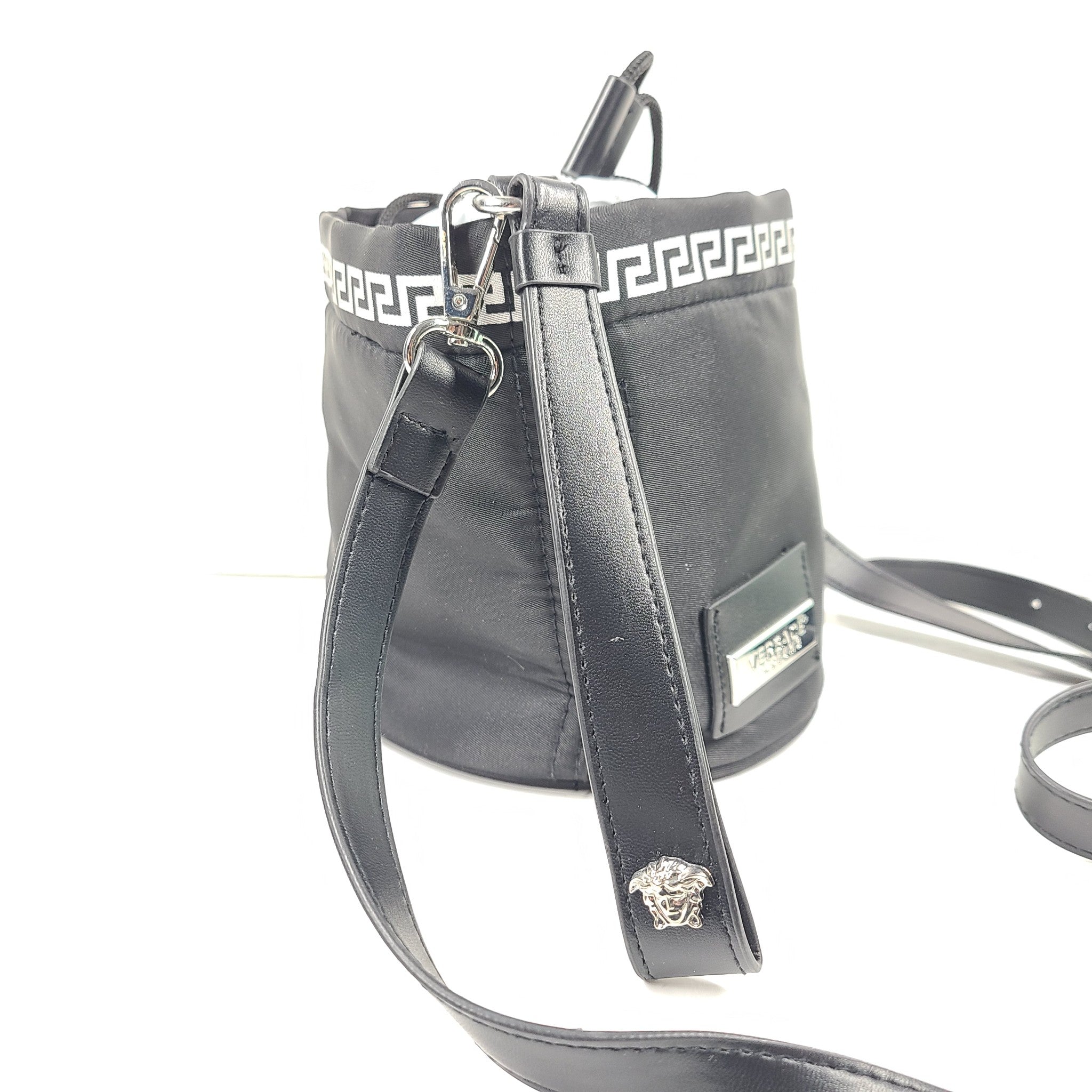 Versace Parfums Crossbody Wristlet Bucket Bag Black Silver Metallic Nylon