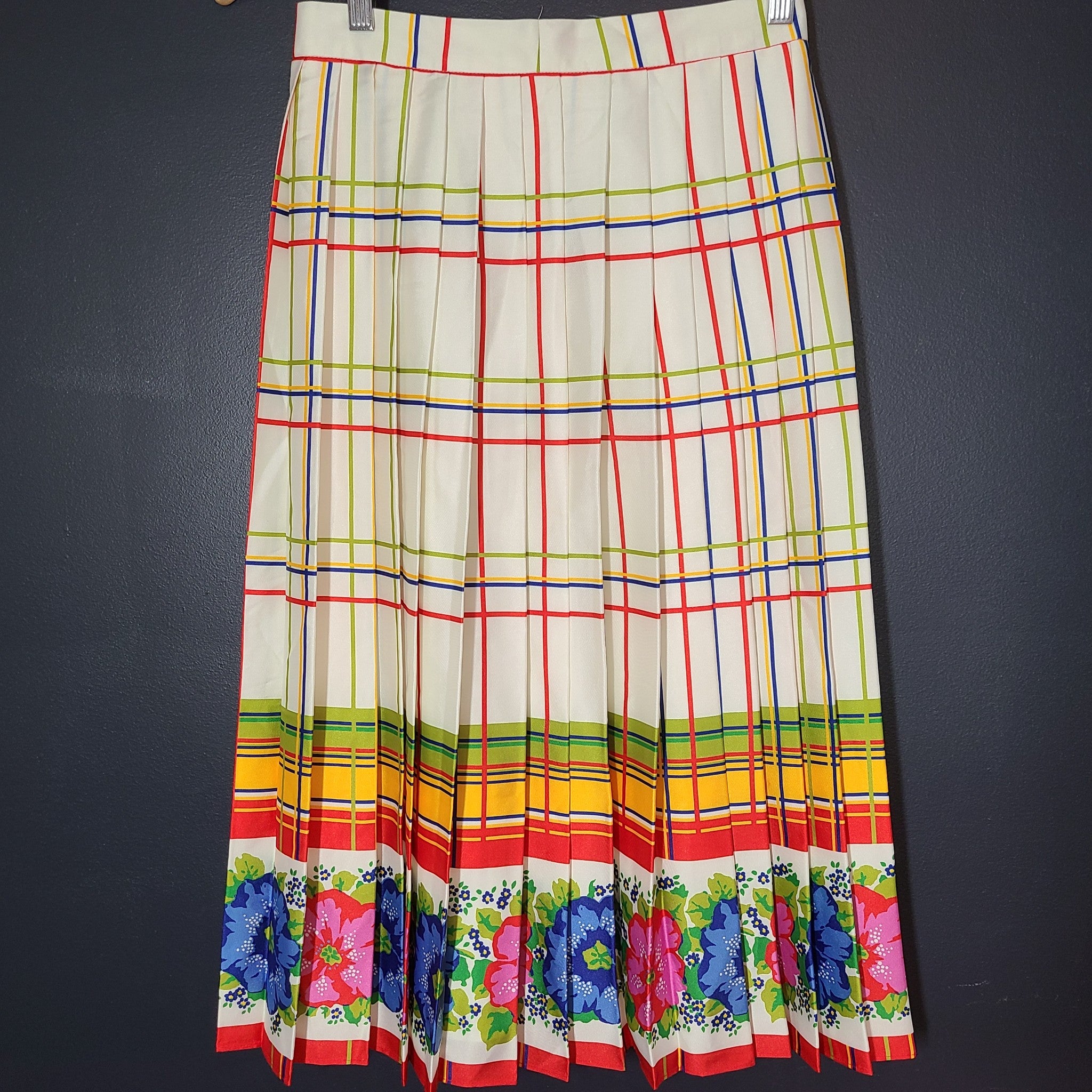 J. Crew Pleated Midi Skirt w/ Floral Border 50s Multicolor Satin Sz 0