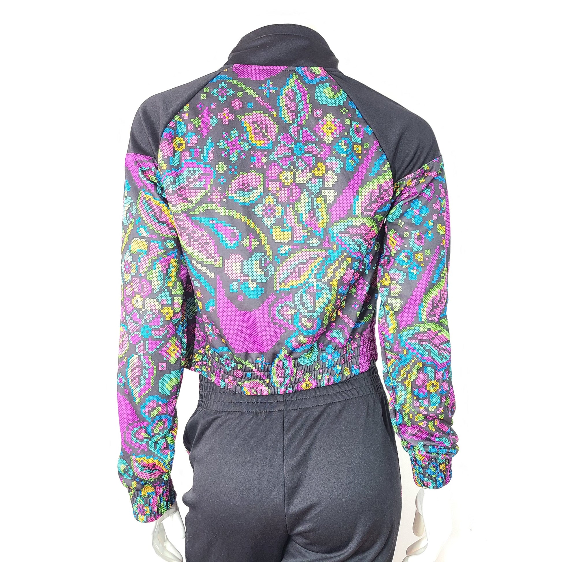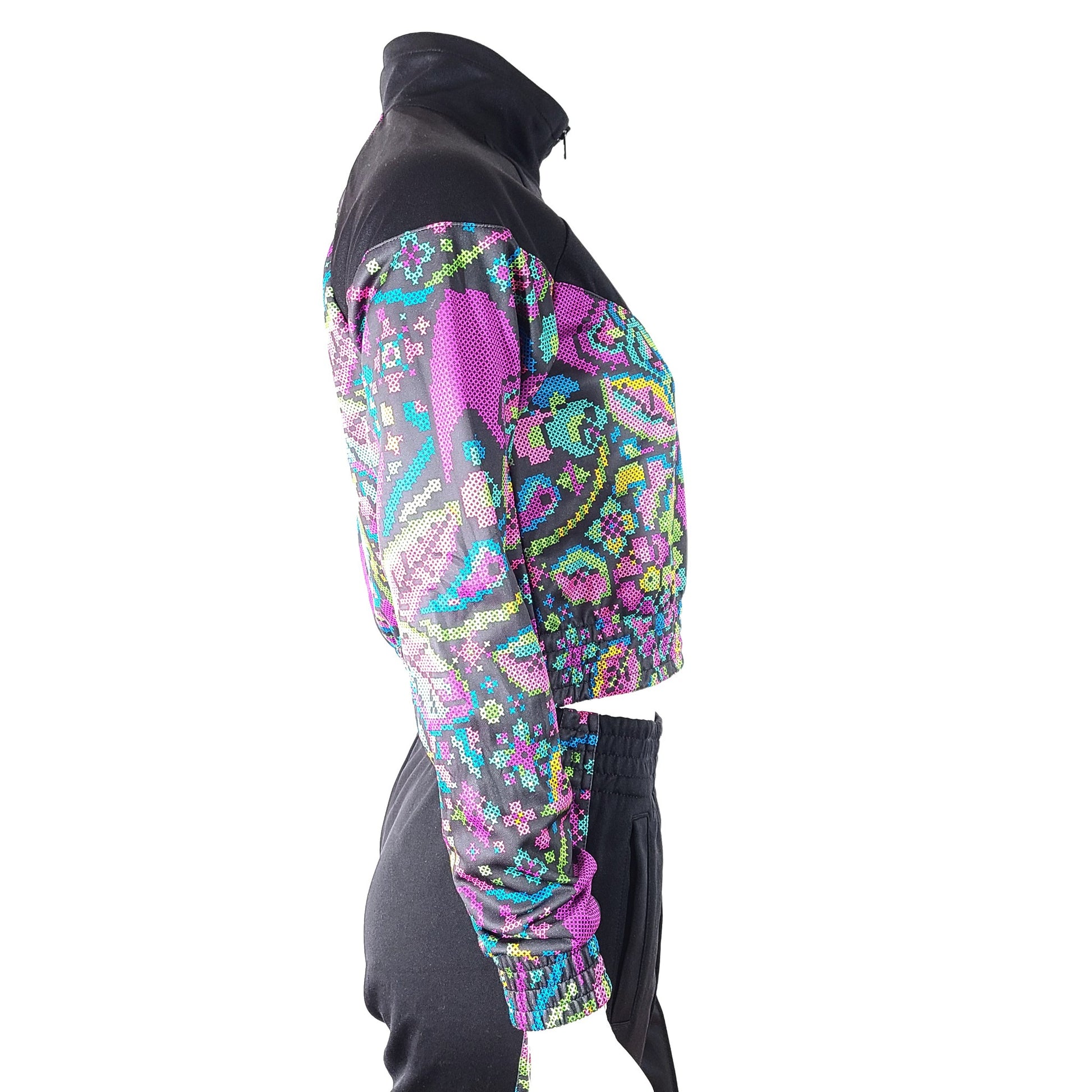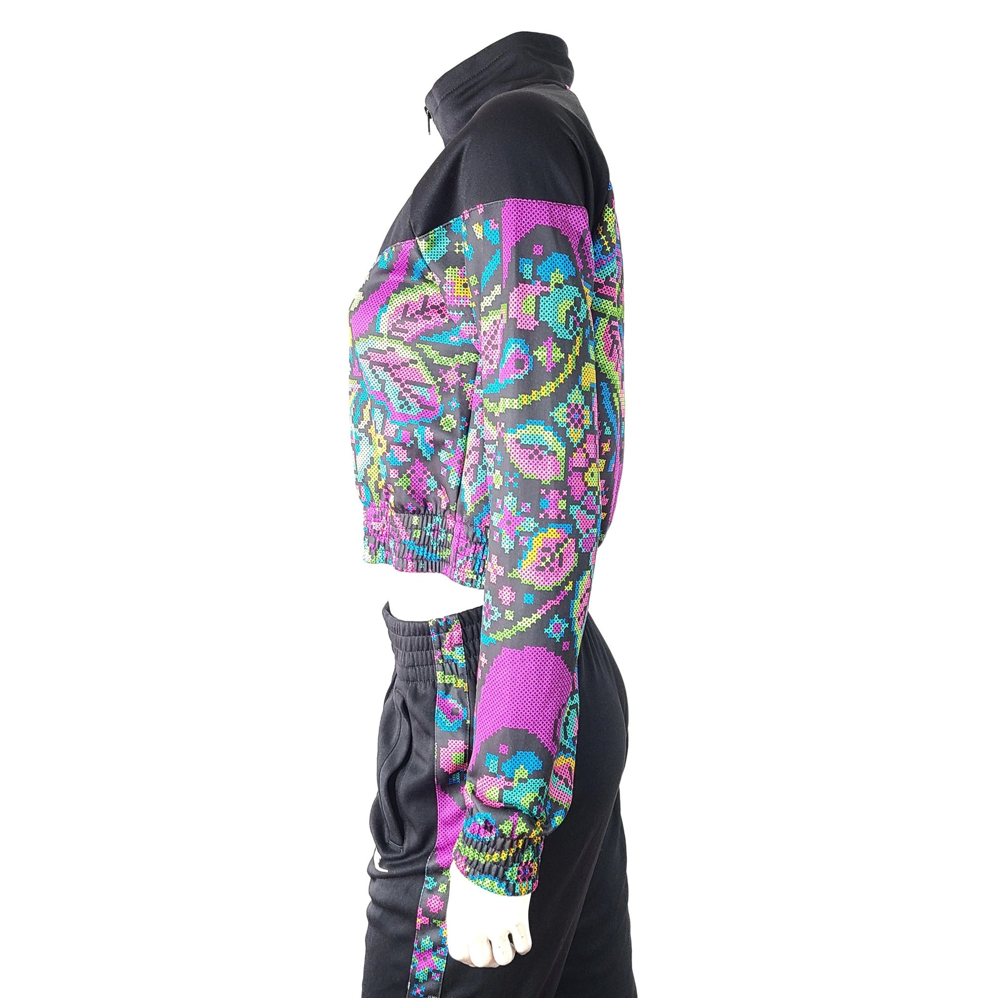 The set includes a cropped jacket and high rise crop track pants with two pockets, suitable for any workout routine or casual outing.
