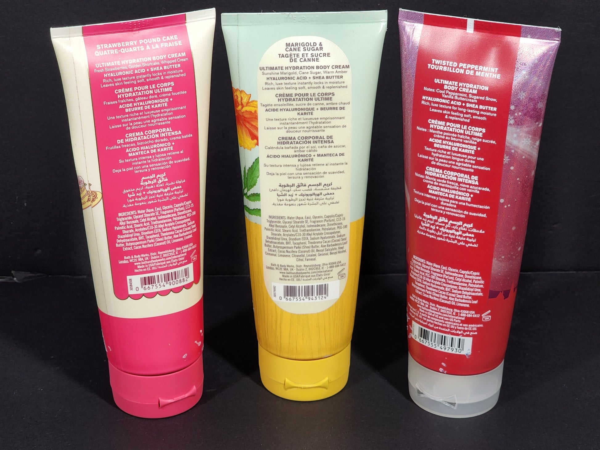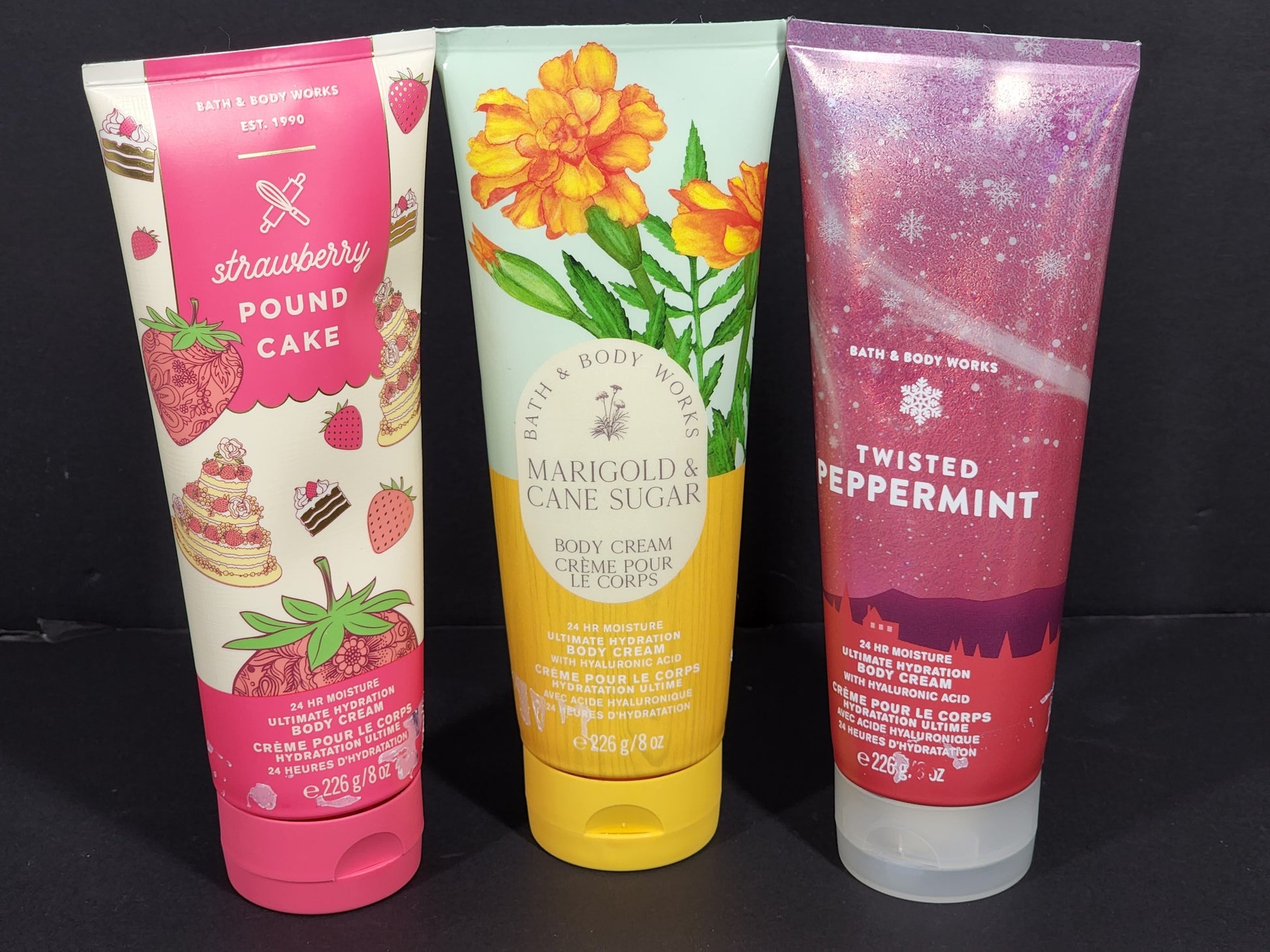 Includes: Marigold Cane Sugar Body Cream 226g/8 oz, Twisted Peppermint Body Cream 226g/8 oz and Strawberry Pound Cake Body Cream 226g/8 oz