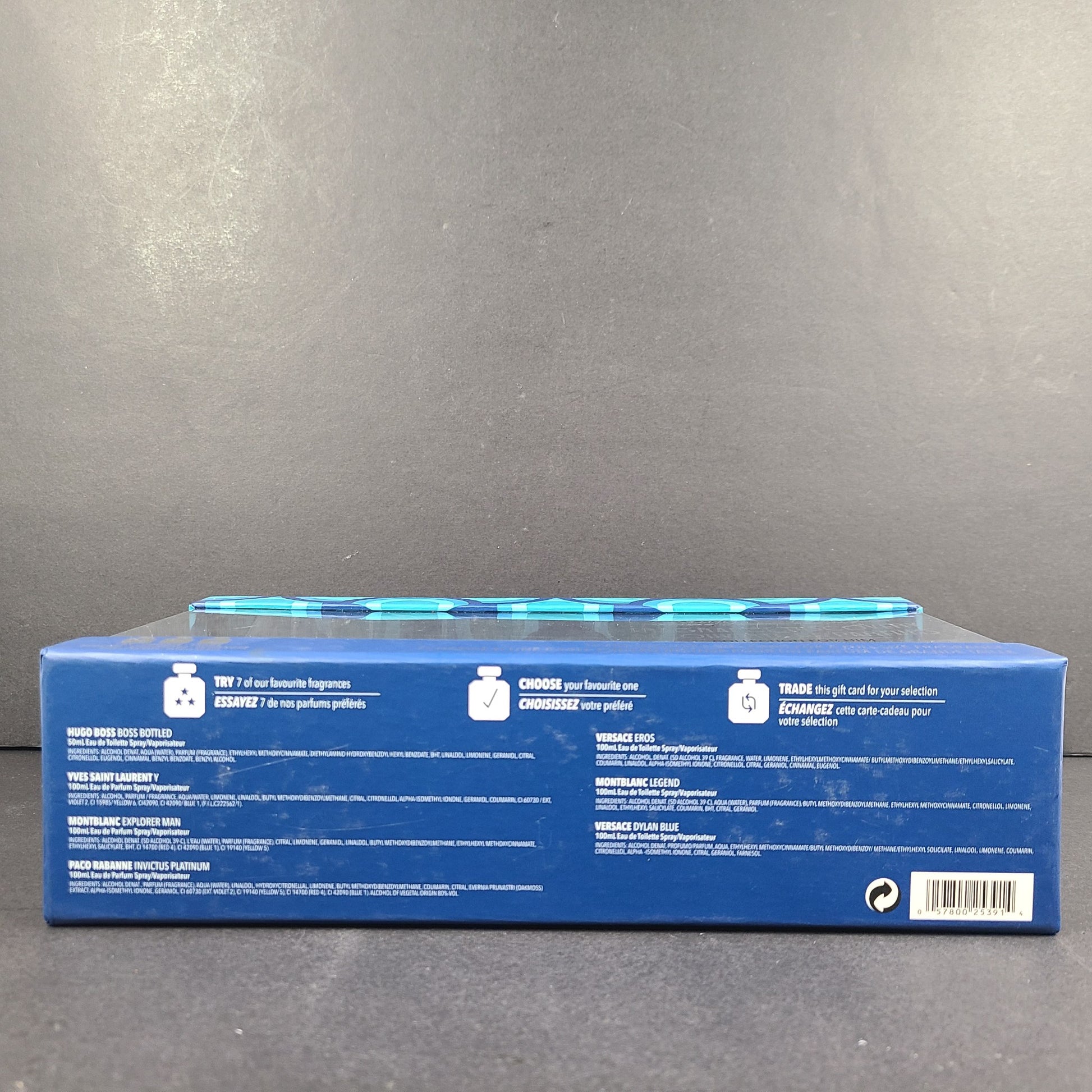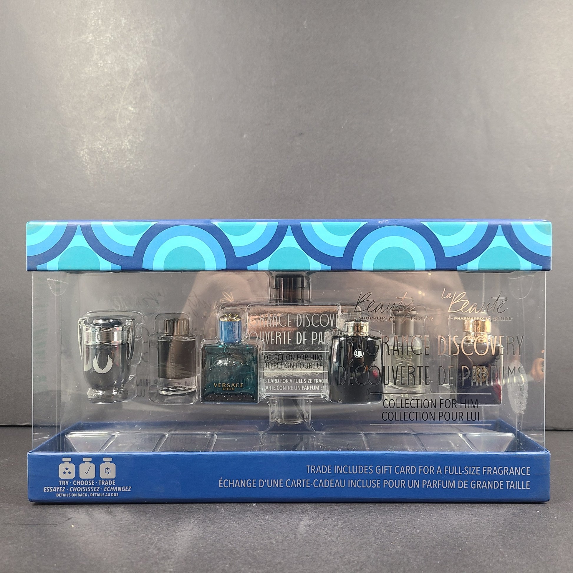 Includes: Set of 7 fragrances: Montblanc Explorer Men EDP Spray 4.5ml ; Hugo Boss Bottled EDT Spray 5ml ; Versace Dylan Blue EDT Spray 5ml ; Montblanc Legend EDT Spray 4.5ml; Paco Rabanne Invictus Platinum EDP Spray 5ml; Versace Eros EDT Spray 5ml; Yves Saint Laurent Y EDP Spray 10 ml - sealed in box. Set also includes a card that you can trade in for one (1) full size fragrance of your choice. PLEASE NOTE THAT THE TRADE OFFER IS ONLY VALID AT PARTICIPATING SHOPPERS DRUGMART AND PHARMAPRIX LOCATIONS IN CANADA.