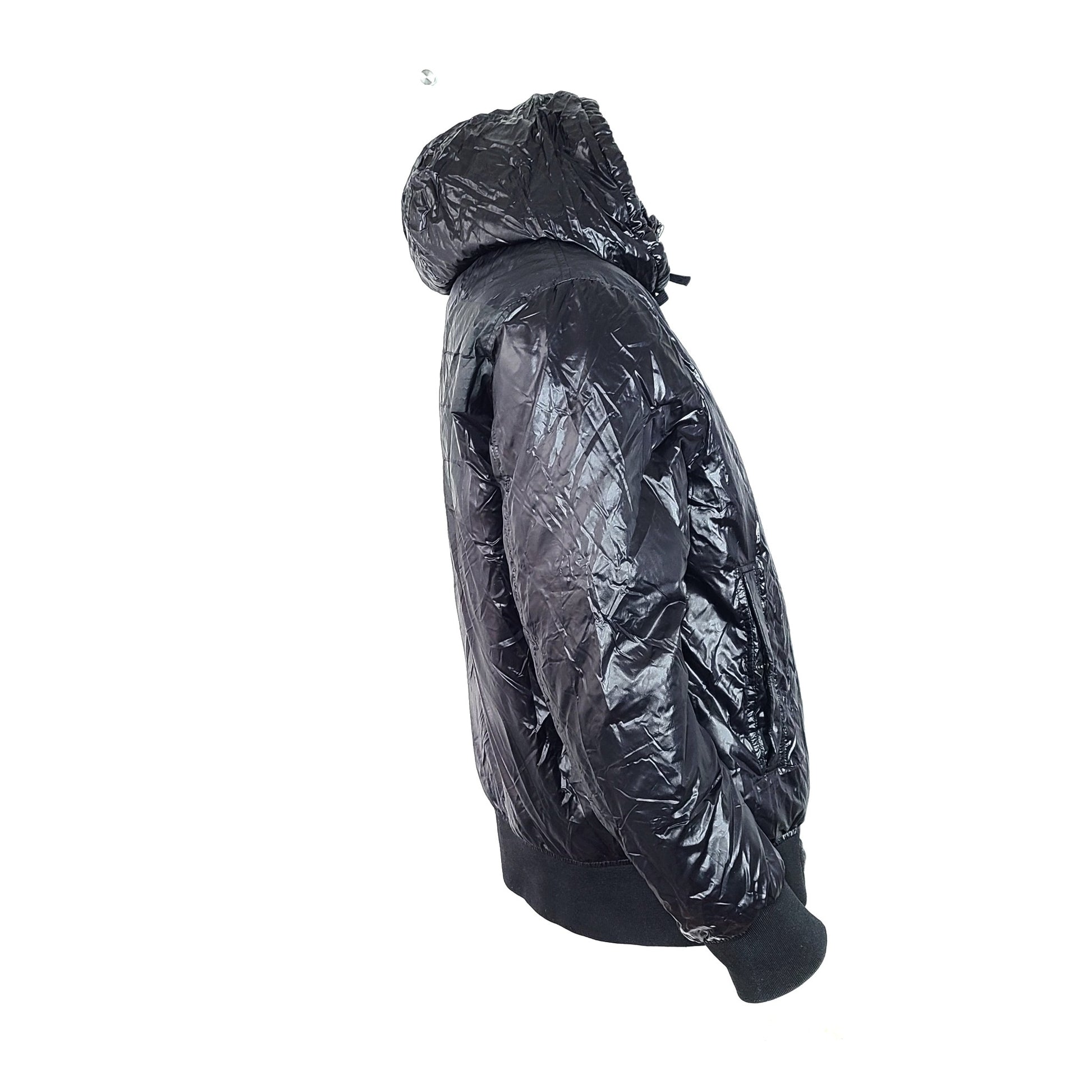 - Puffer bomber jacket with full zip fastening at the high neck. Hood can be zipped away into the collar.