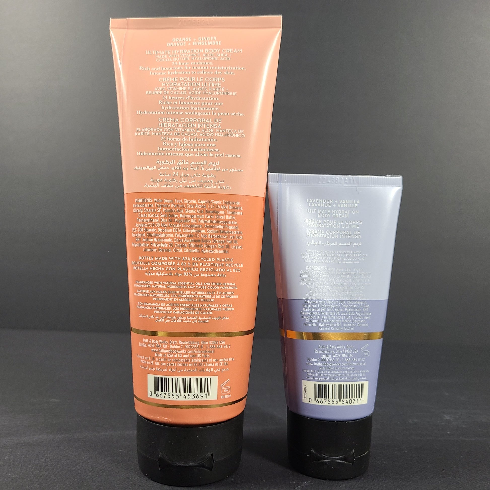 Includes: 8 fl. oz. / 226 g Aromatherapy Orange + Ginger Ultimate Hydration Body Cream; 2.5 oz. Lavender + Vanilla Ultimate Hydration Body Cream.
