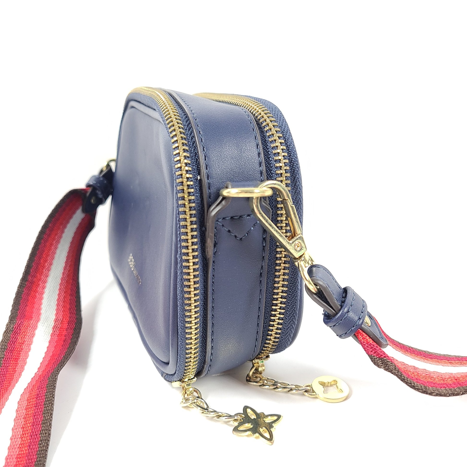 Each zipper has a different gold toned logo butterfly pull charm.