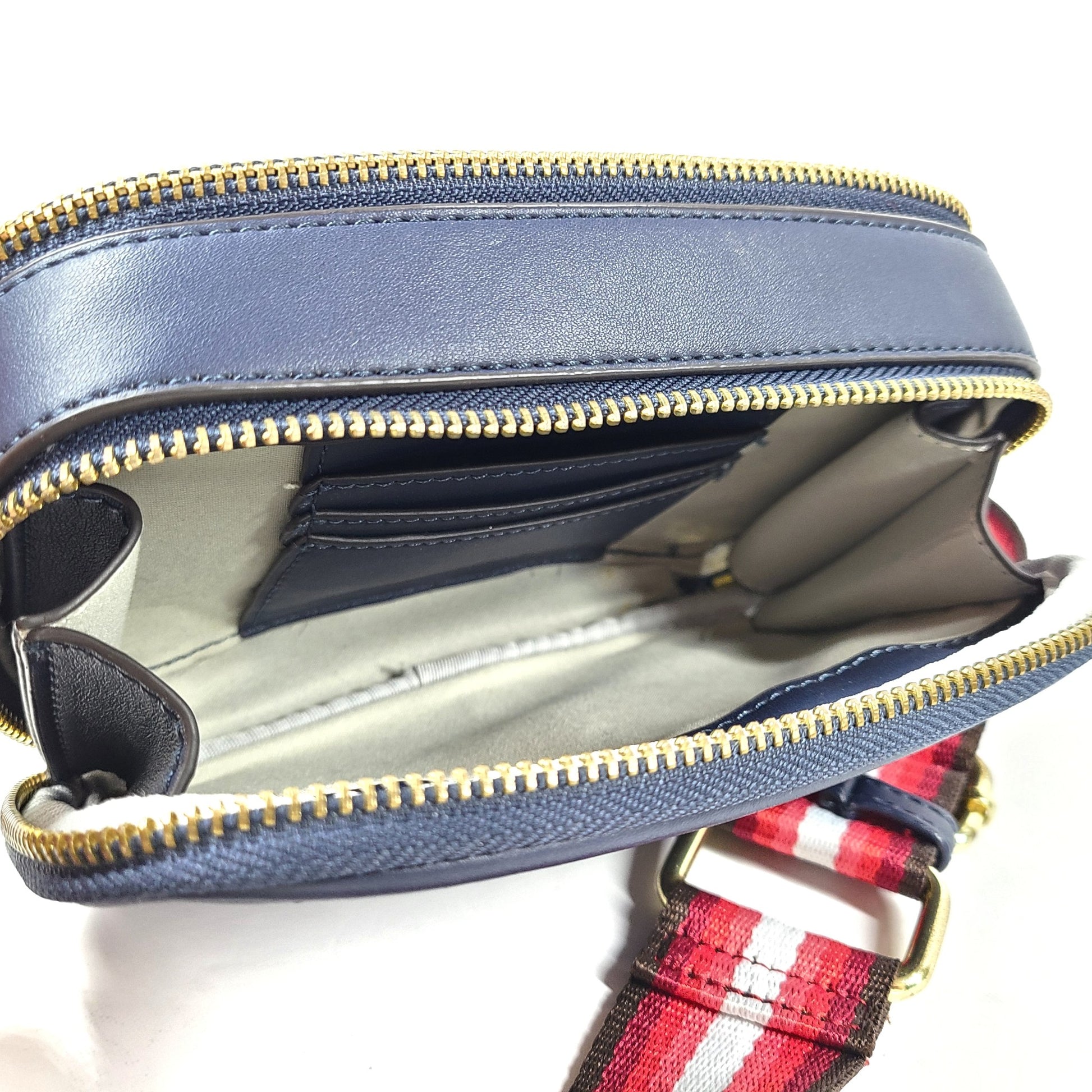 Adjustable and removable shoulder strap Multi colored stripe pattern.