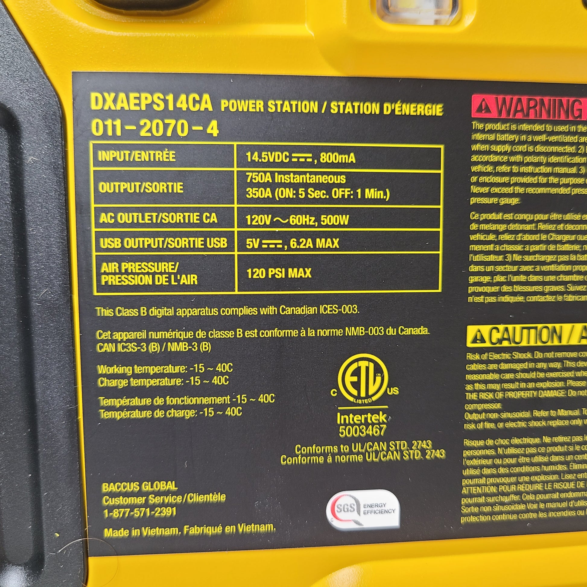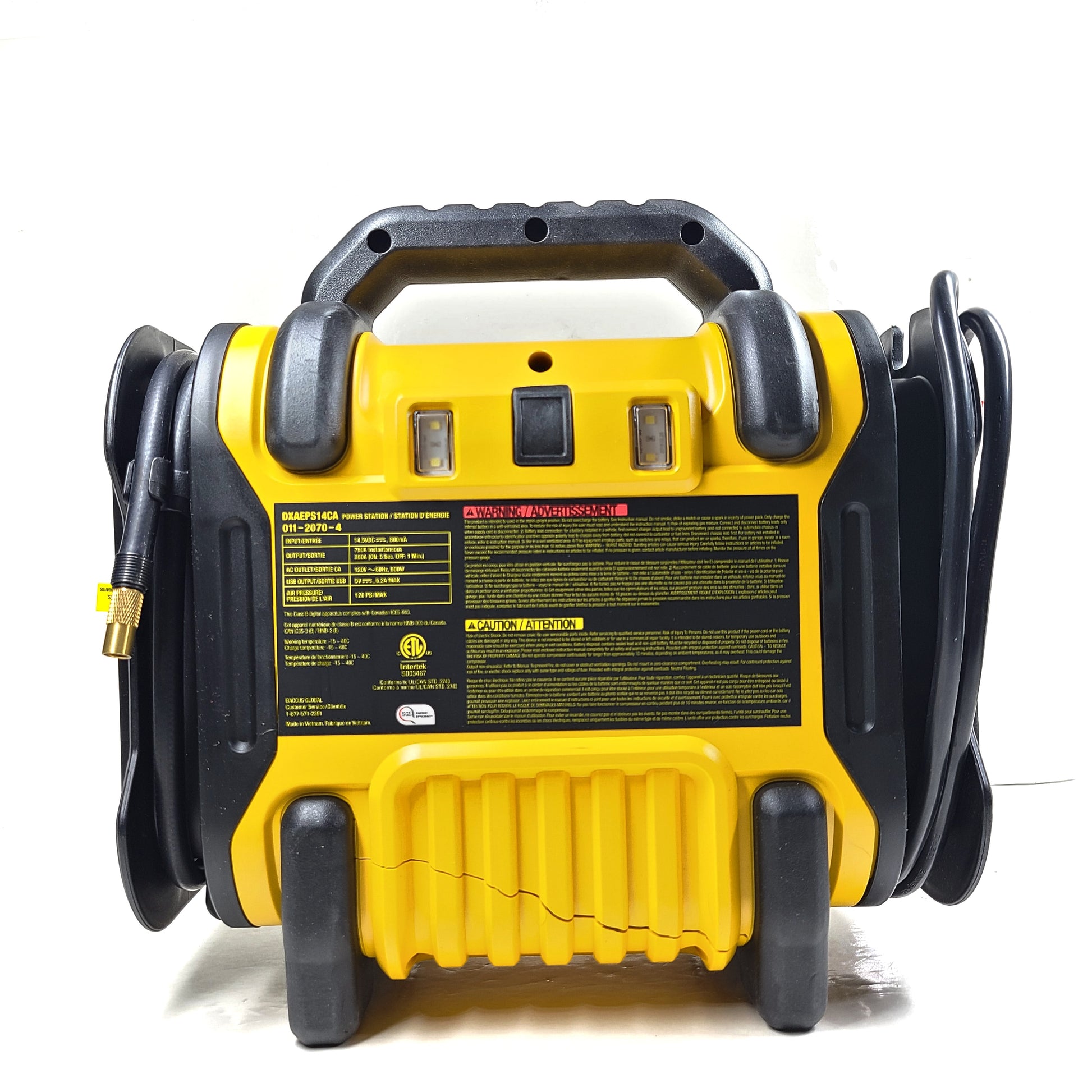 The DEWALT DXAEPS14 professional grade power station is one of our most powerful jump starters with 2000 peak amps to jump start vehicles up to V8. It features a 500-Watt AC inverter, 15W USB-A Port,USB-C 25W PD Port, 120 psi digital compressor and LED work light all in a portable package. It's perfect for tailgating, camping trips or roadside assistance. It doesn't matter whether your car won't start, your phone battery is dying or your tire's running flat the DXAEPS14 is the perfect tool for the job.