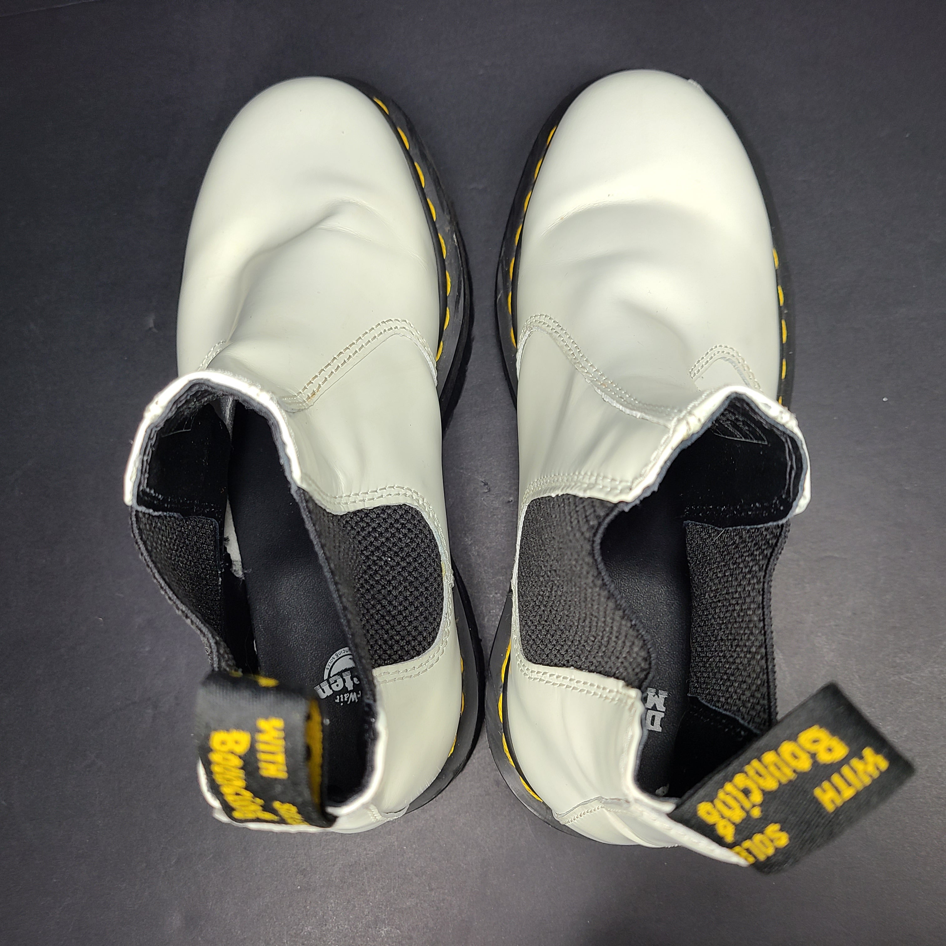 Description: Embrace timeless style with these Dr. Martens 2976 Quad Chelsea Boots. A classic white leather design with a touch of '80s history.