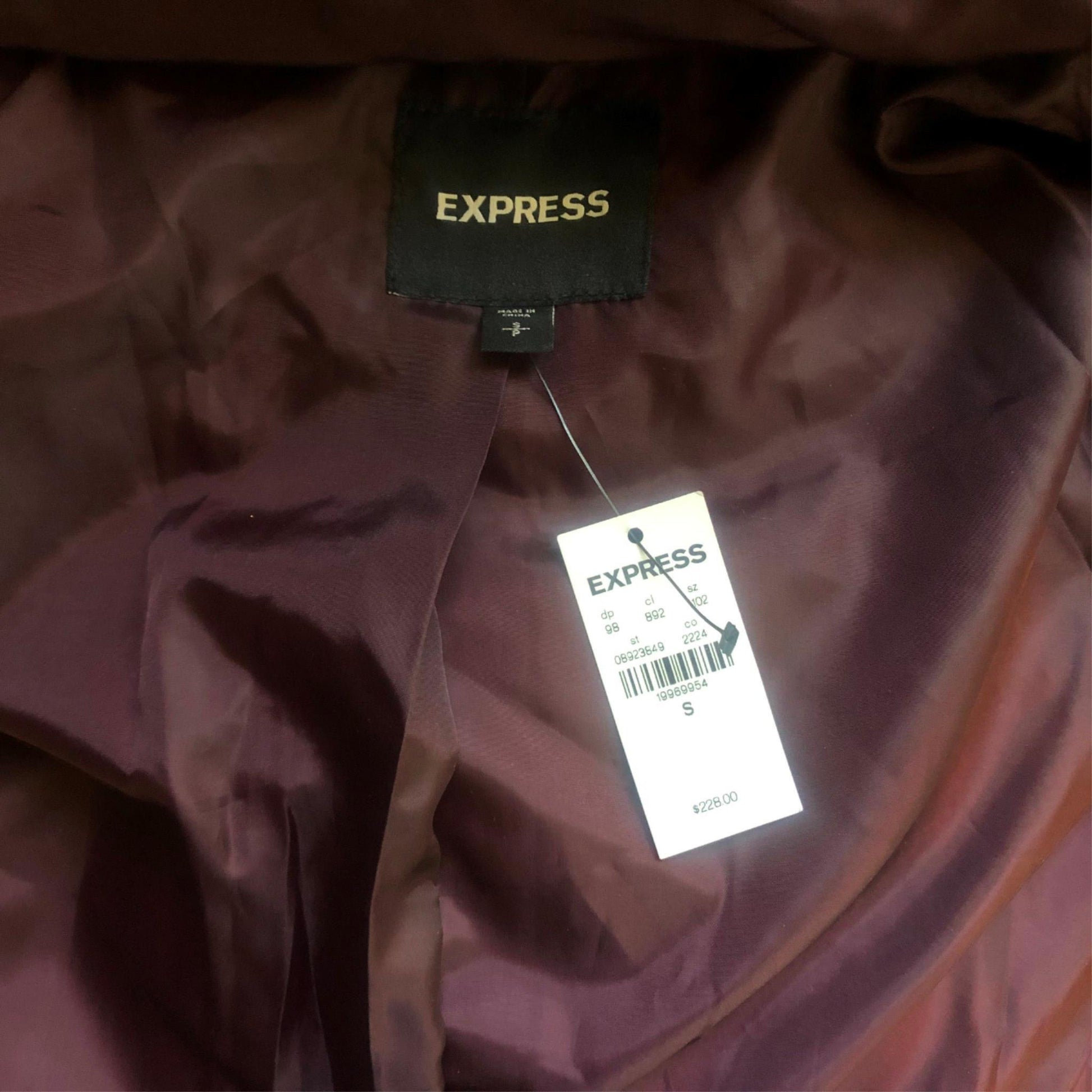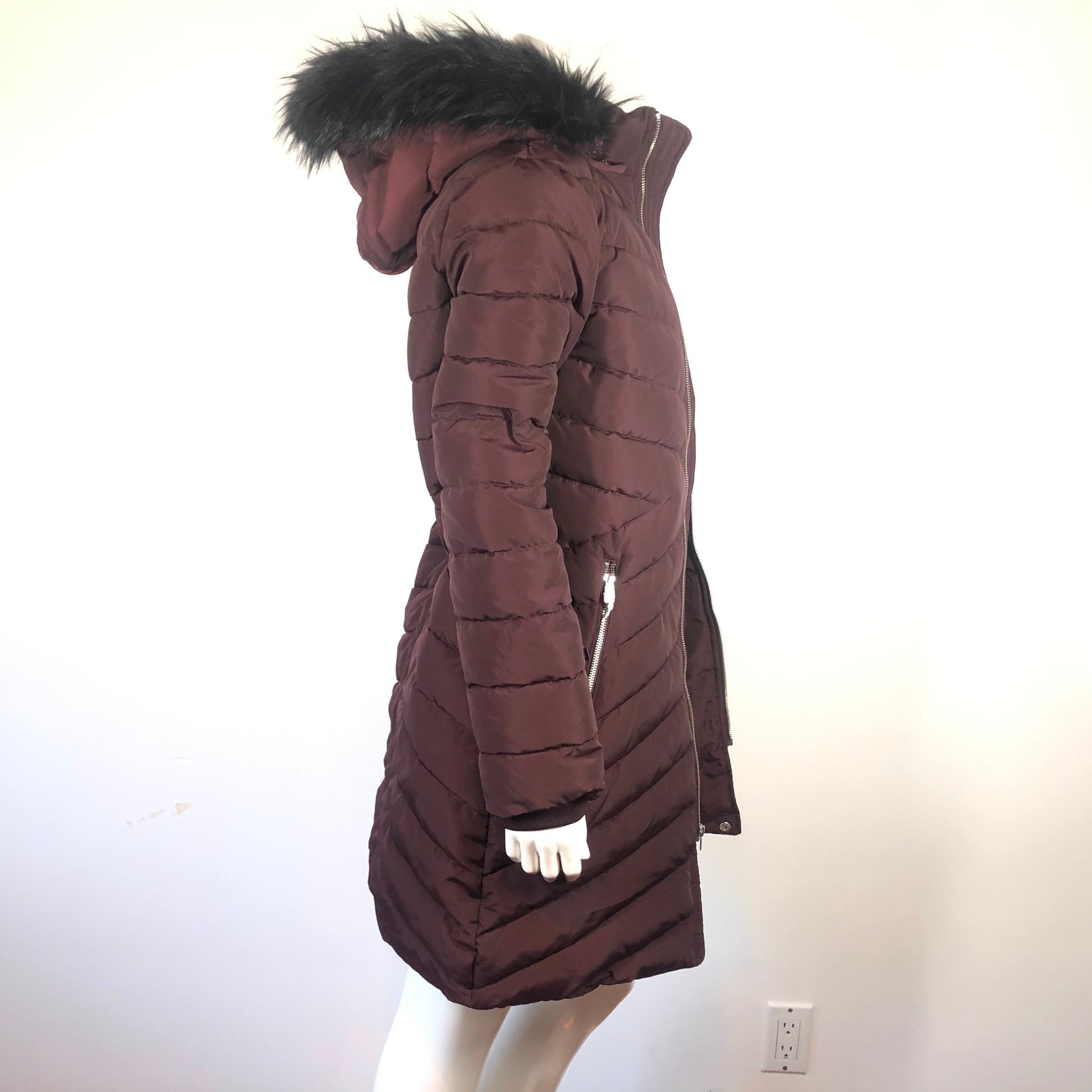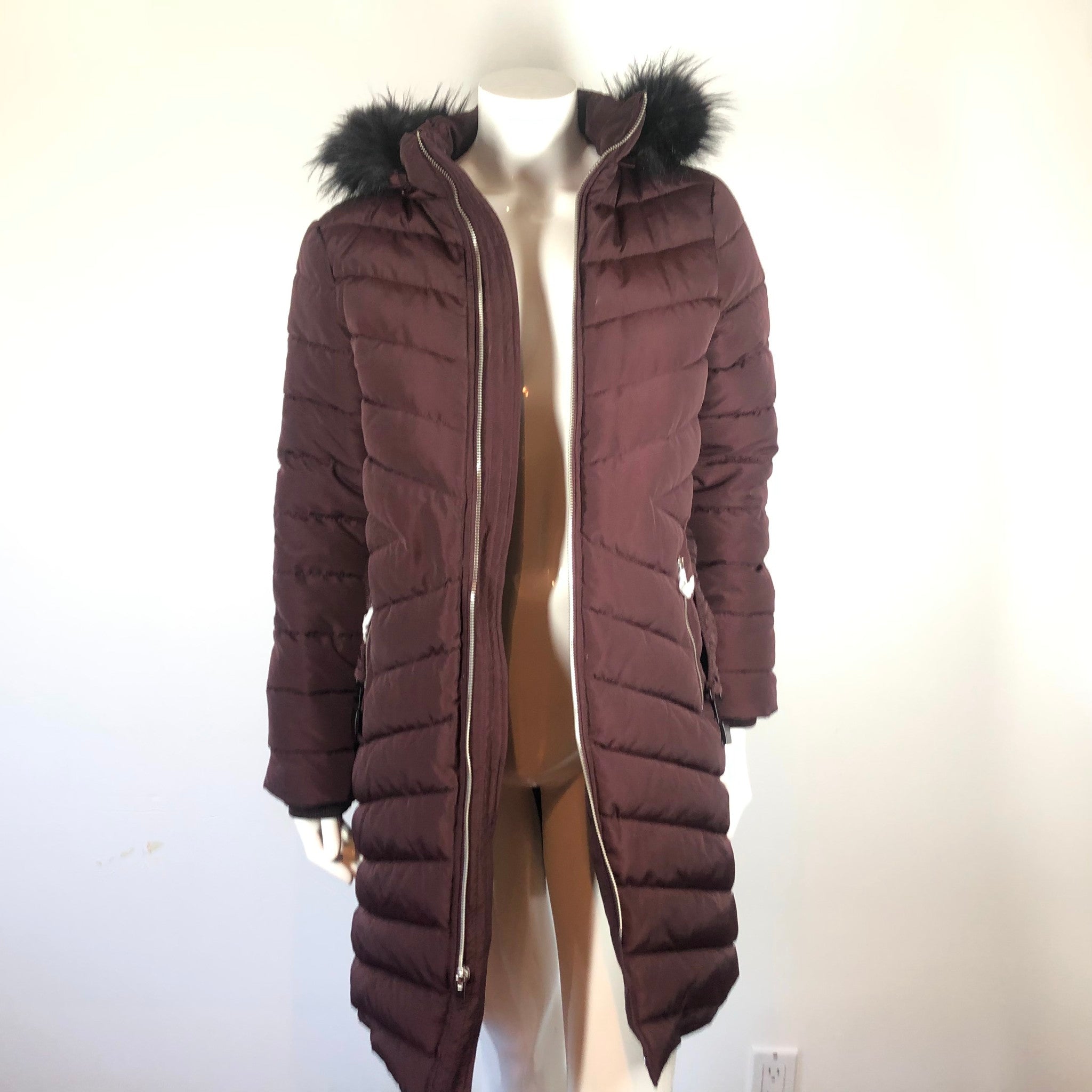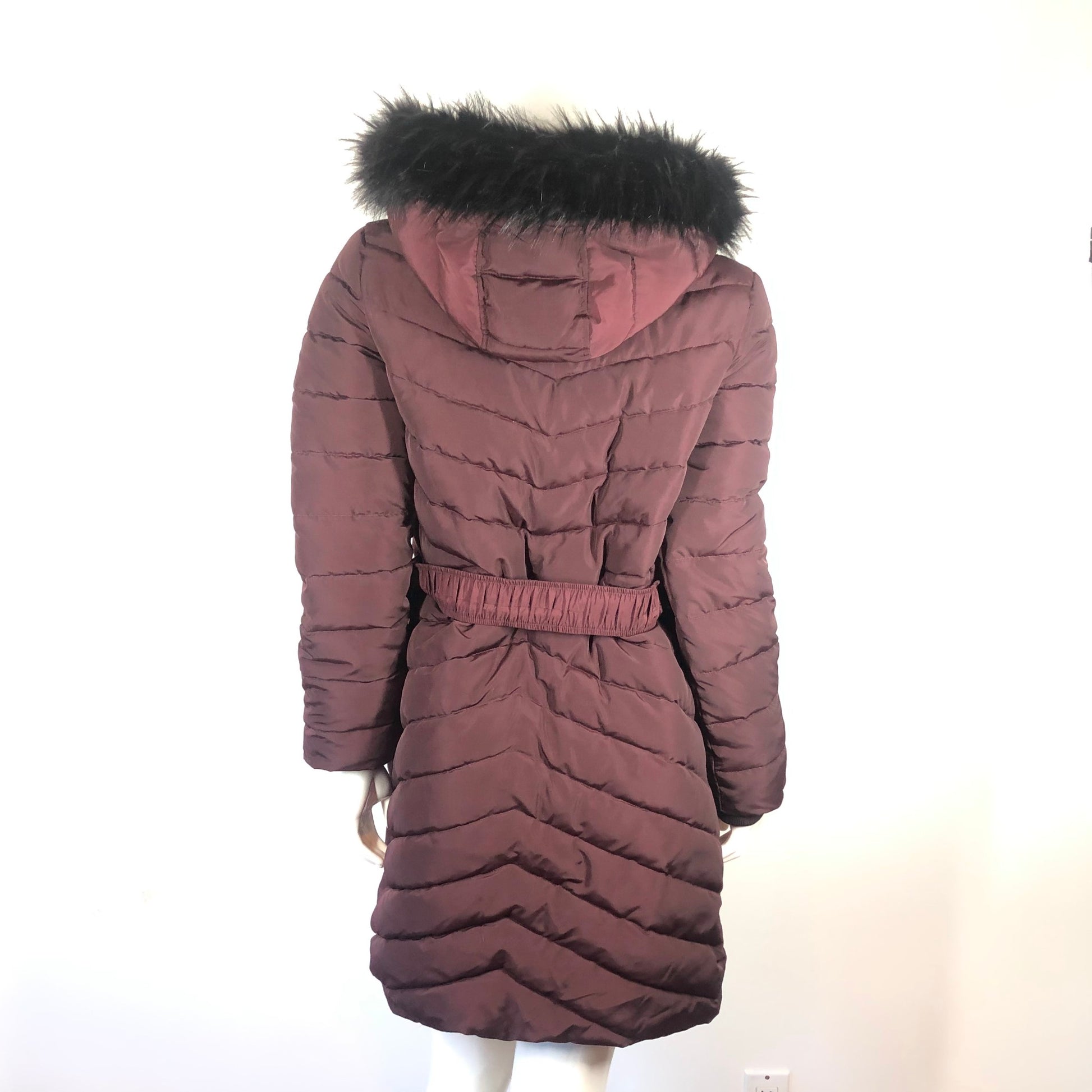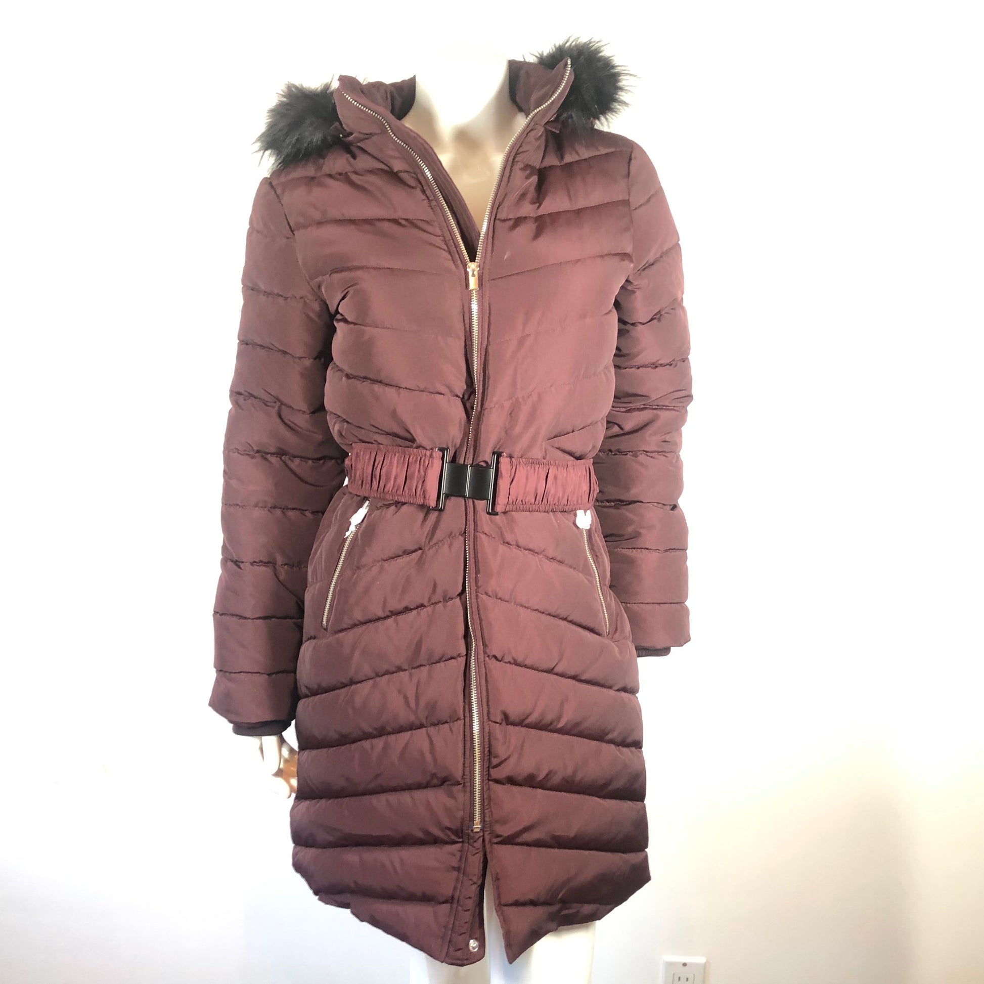 Express Women's Puffy Coat Insulated Mid Length Maroon Fur Hood with Belt Sz S