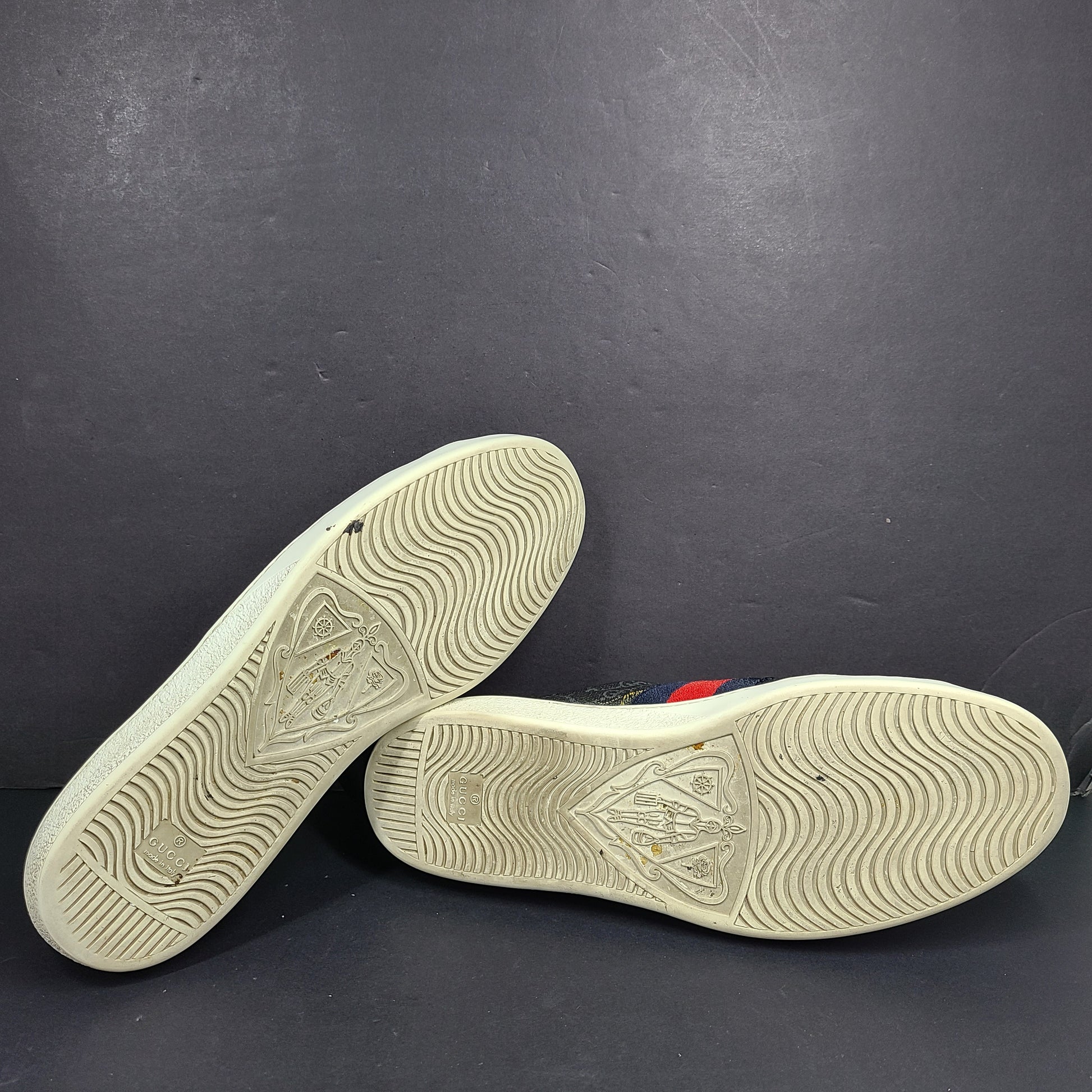 Outsole: White rubber outsole with Gucci traction pattern.