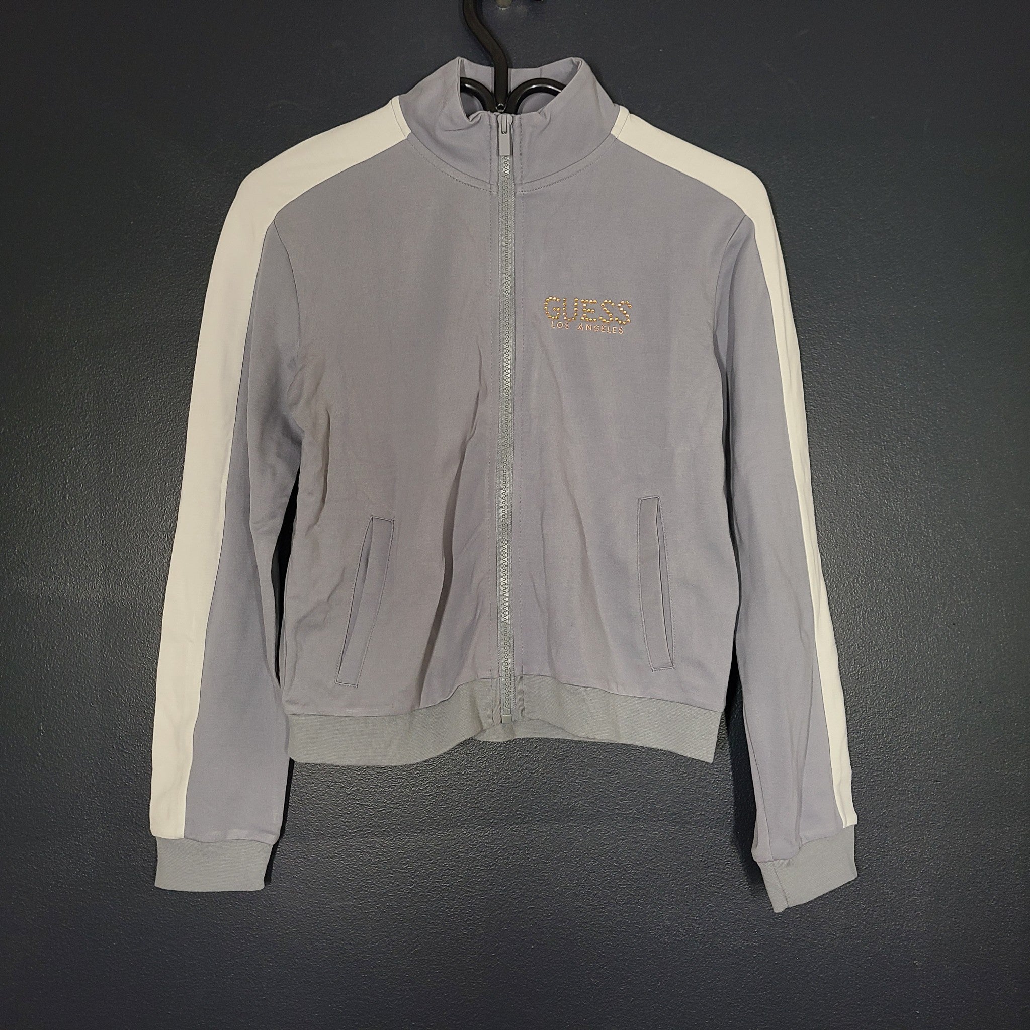 Guess Girl's Track Jacket Full Zip Sweater Gray Rhinestone Logo Sz 12