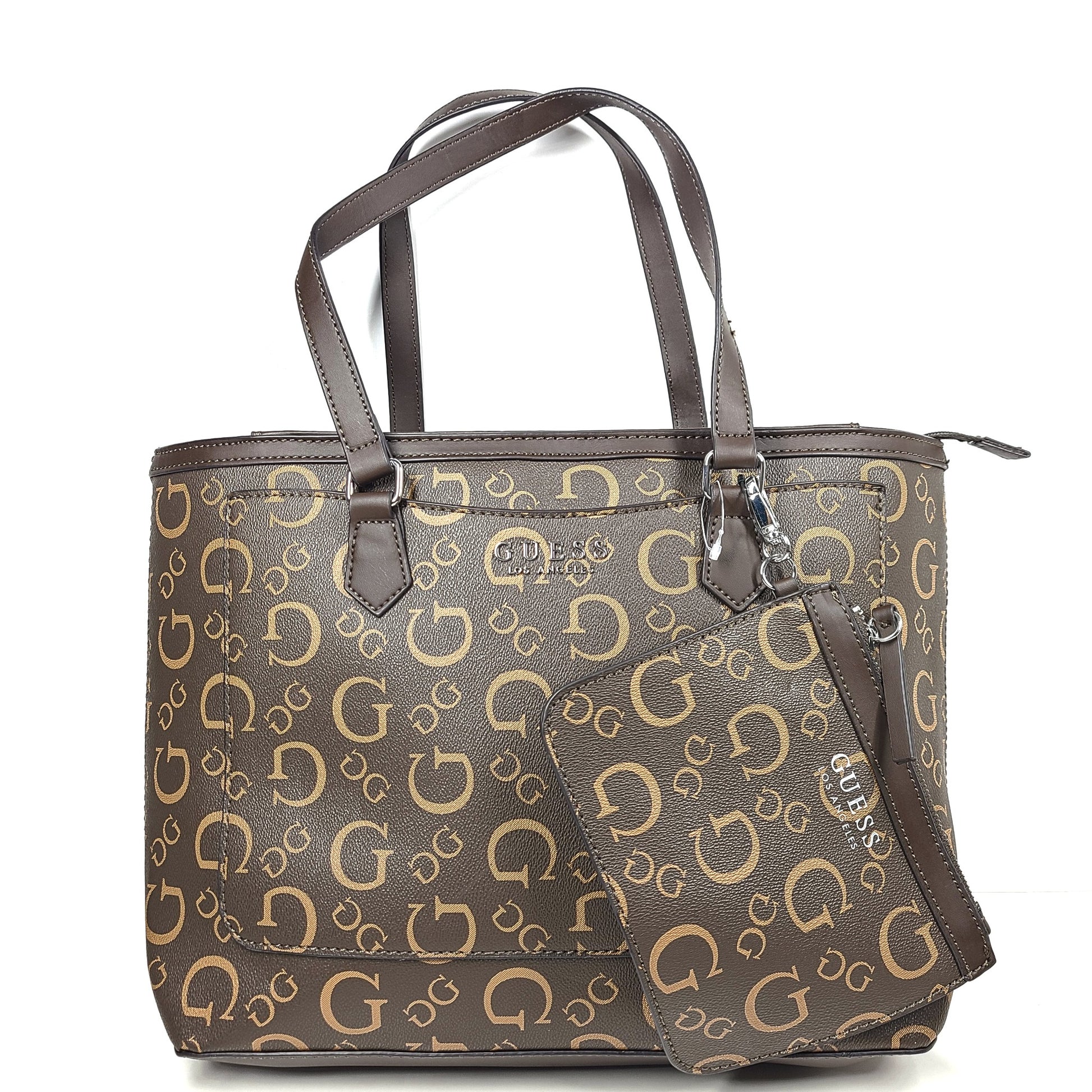 GUESS Medford Logo Tote Bag + Pouch Monogram Print Shoulder Strap Brown HH902925