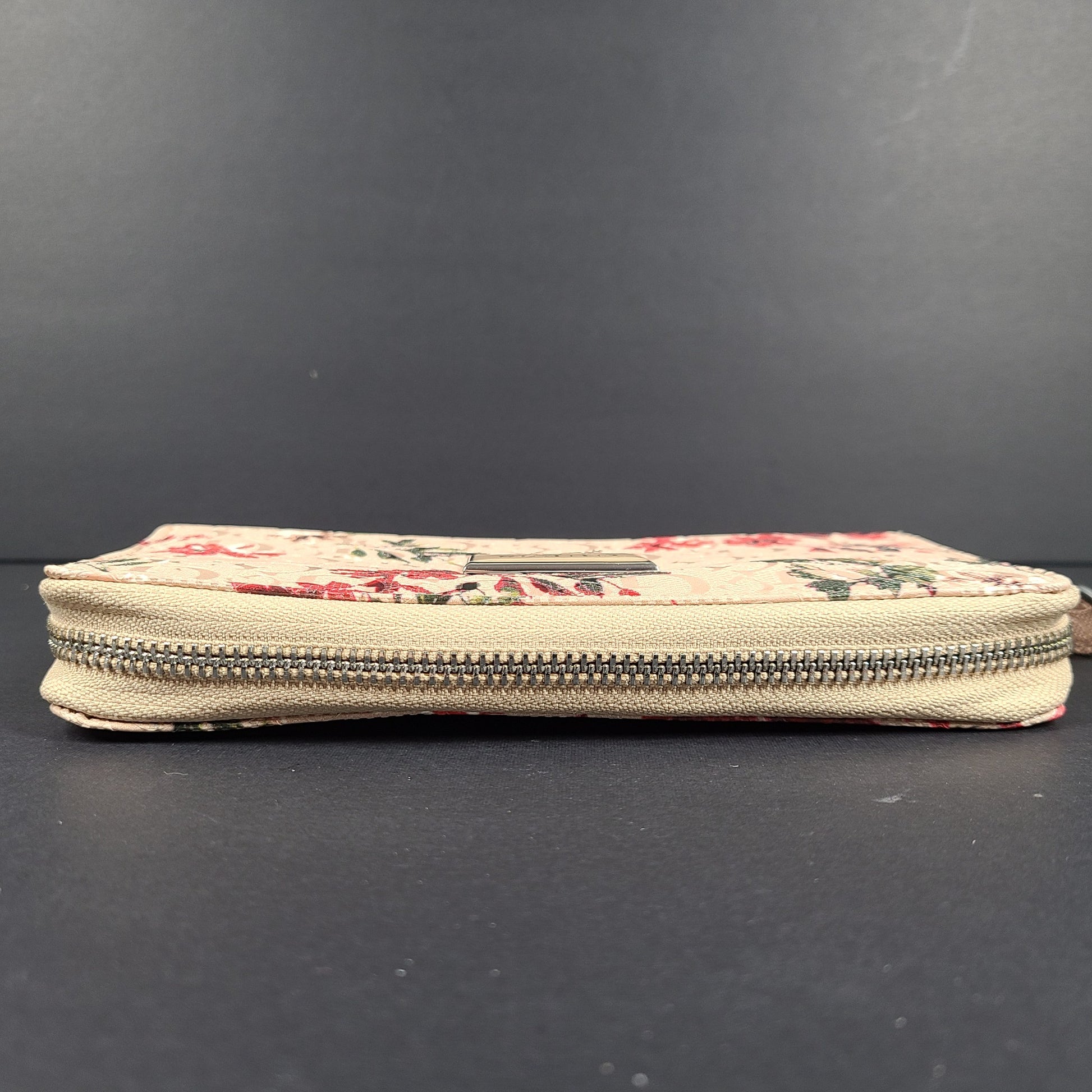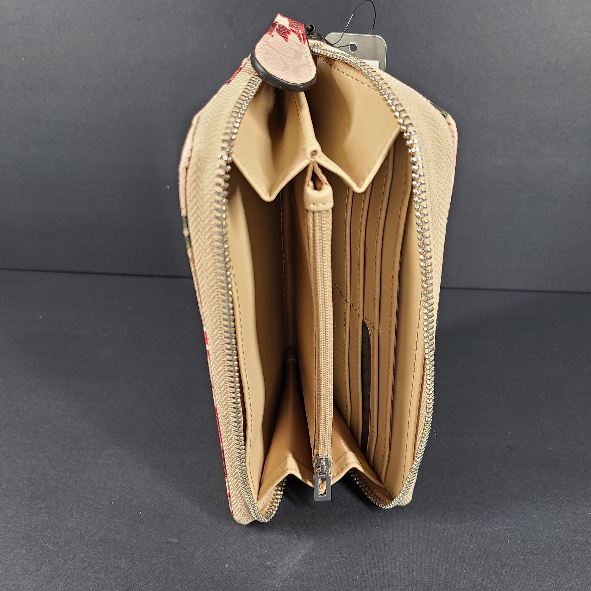 Dimensions: Exterior zip pocket Interior: 2 slip pockets, zip pocket, 6 card slots, Zip around closure.