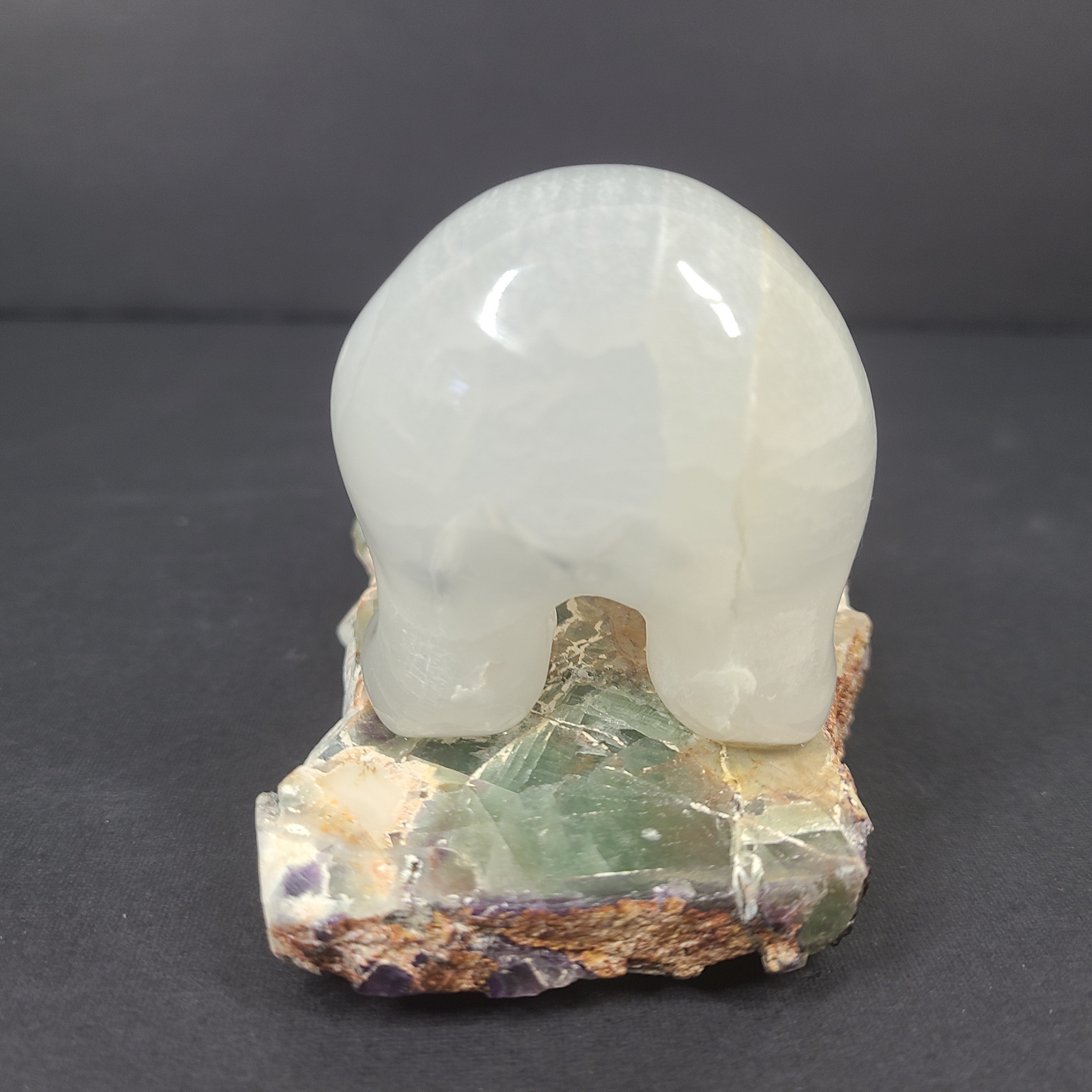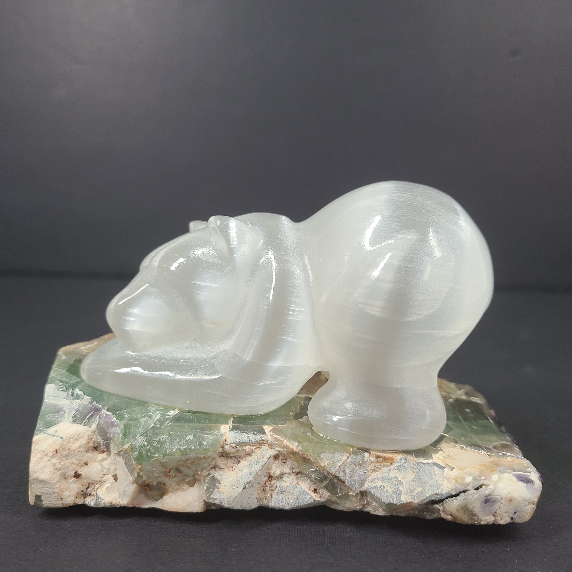 Eddie Lee Playful Bear Sculpture Carved Selenite on Fluorite Base