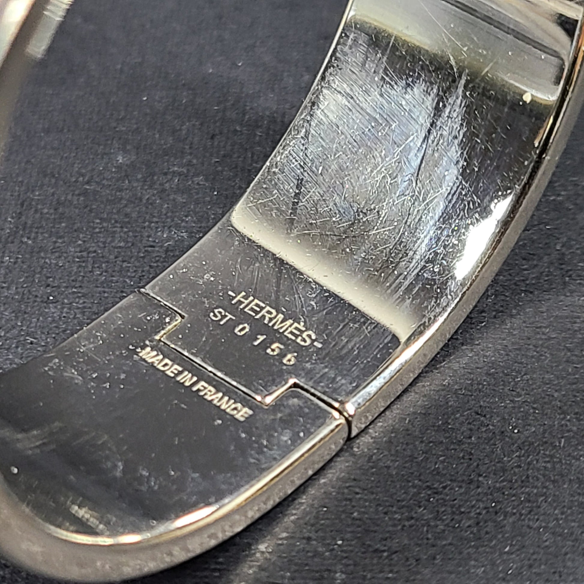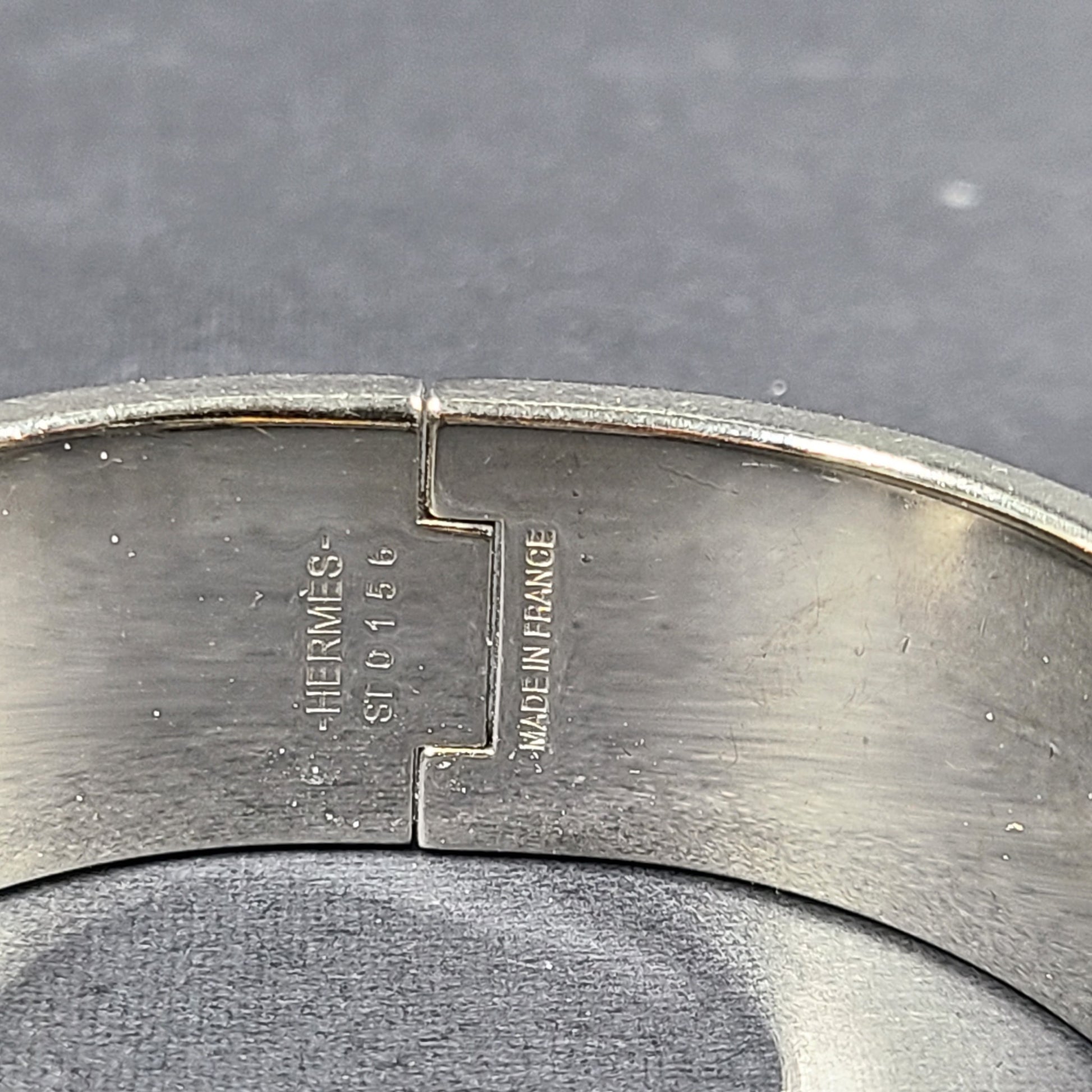 To open and close your Hermès bracelet, follow these three steps. 1. Carefully slide it over your wrist. 2. Push both ends together to close. 3. Rotate the "H" of the clasp until straight. And Click!