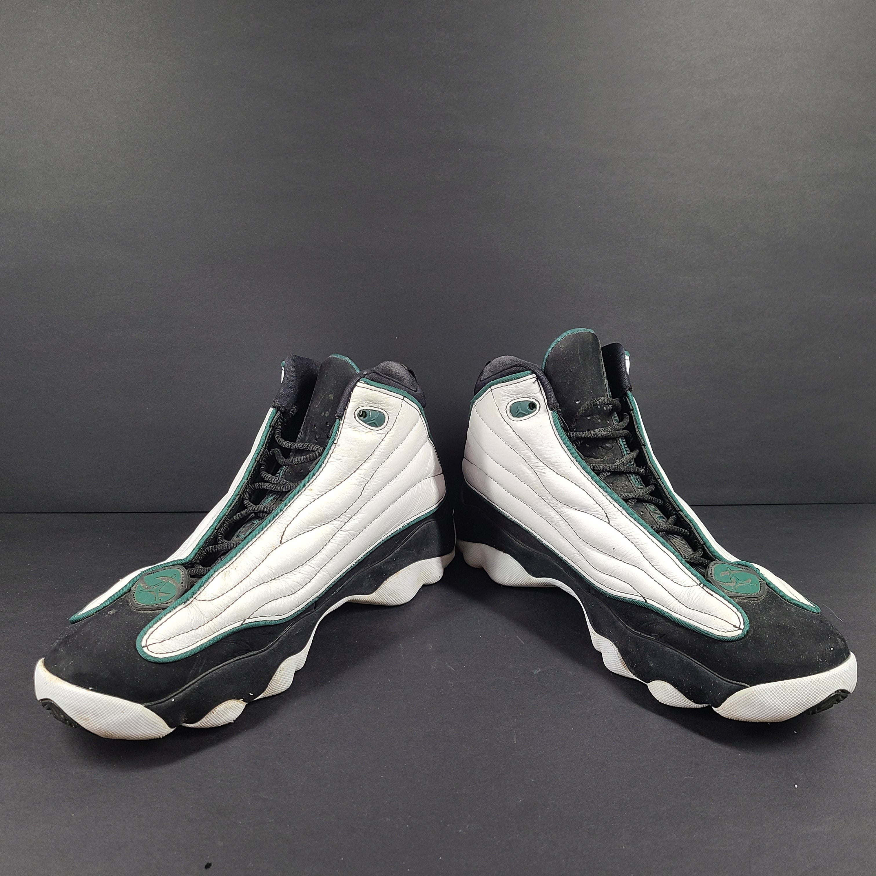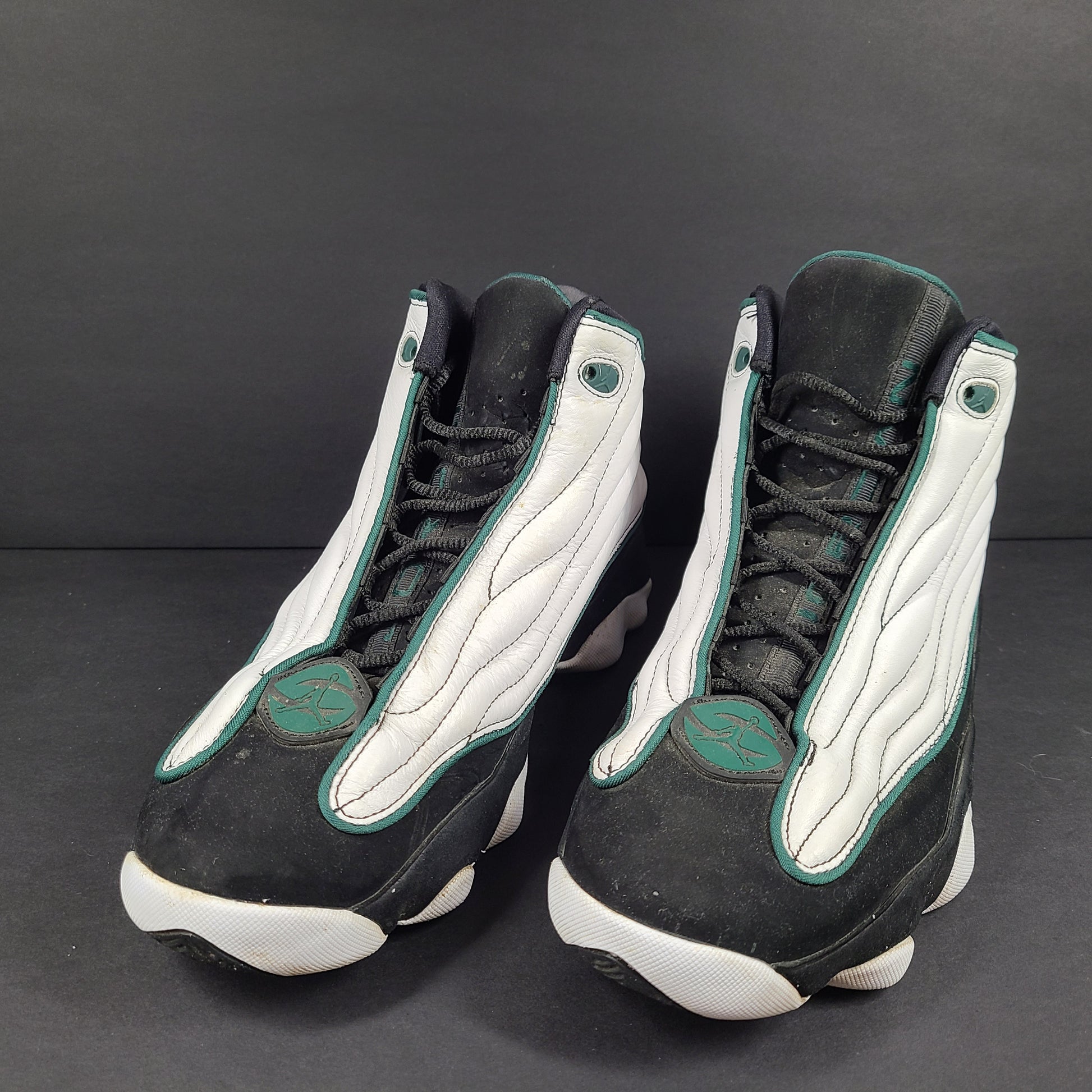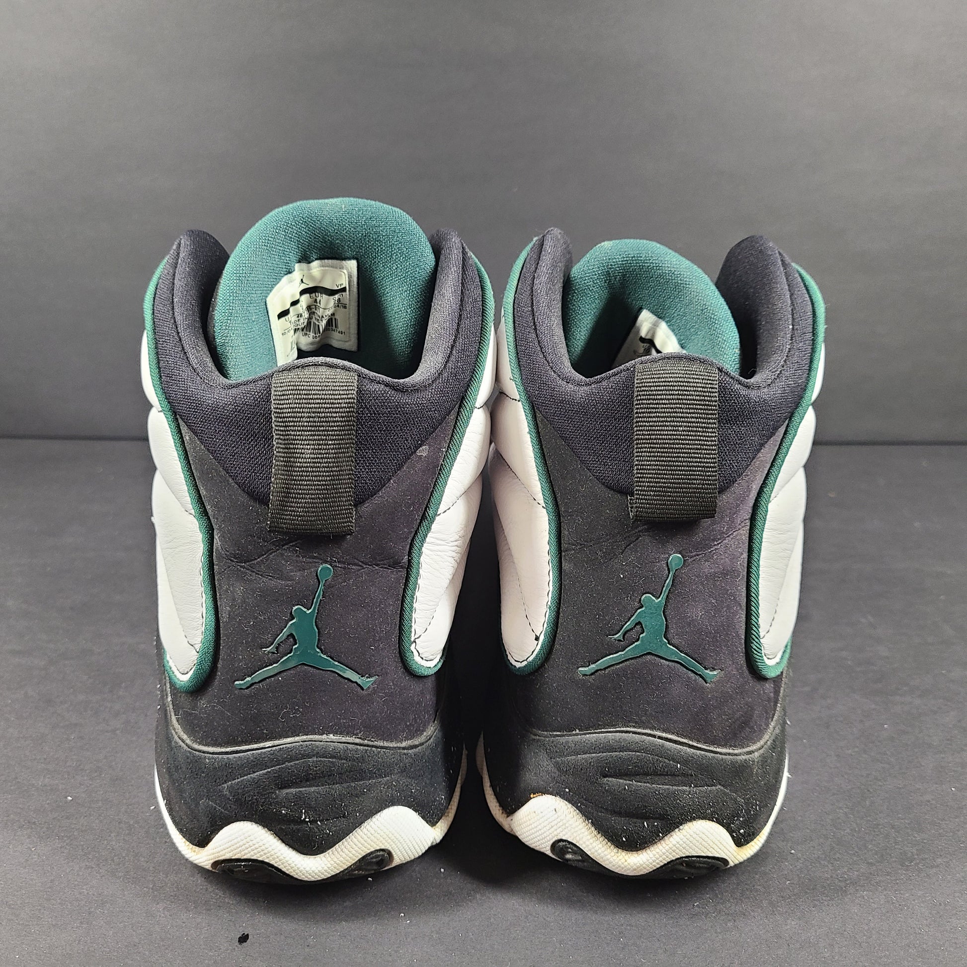 Upper: White leather paneling + Black nubuck overlays / mudguard, heel, and tongue area. Dark Pine (deep green) accents on Jumpman logos on toe‐box and heel and trim.