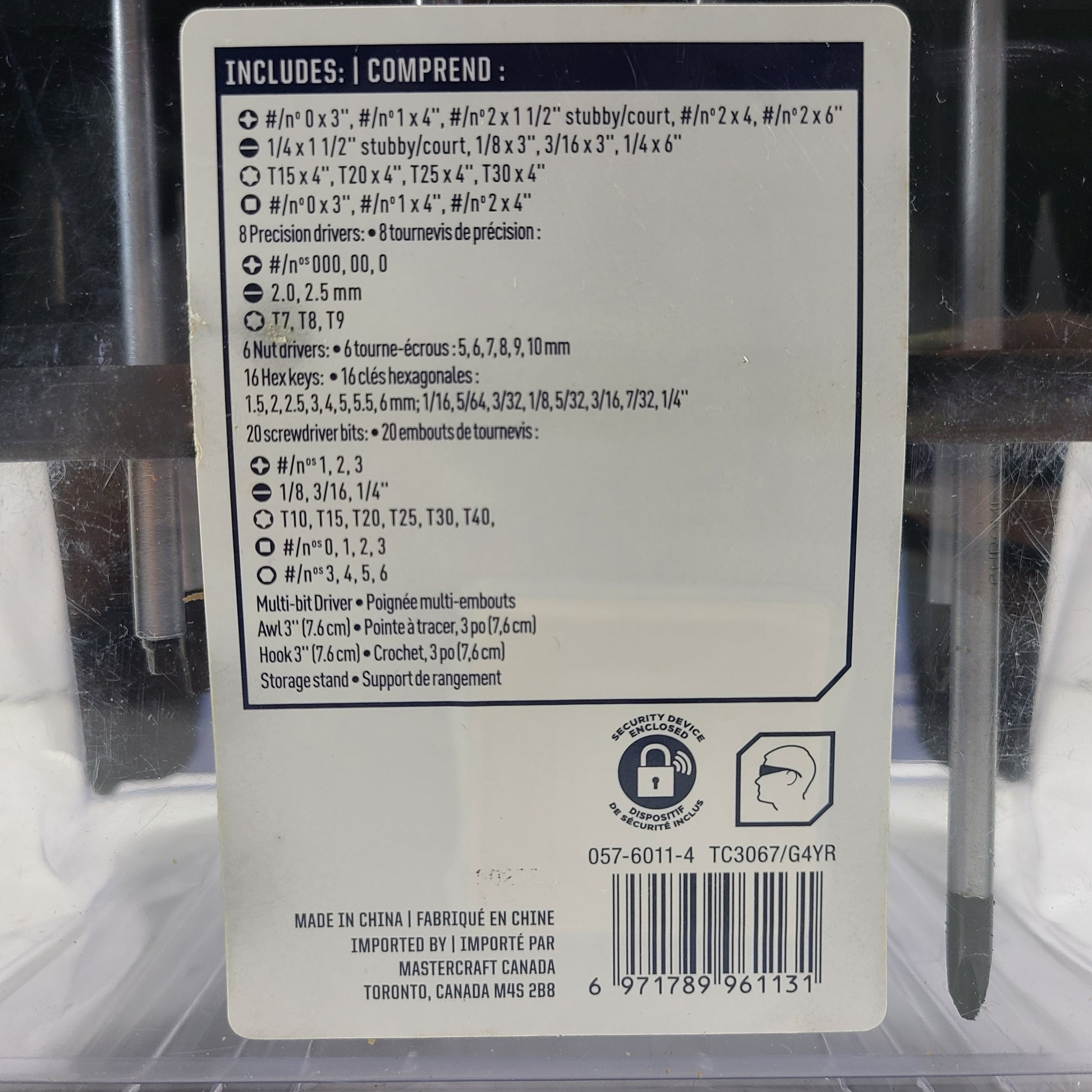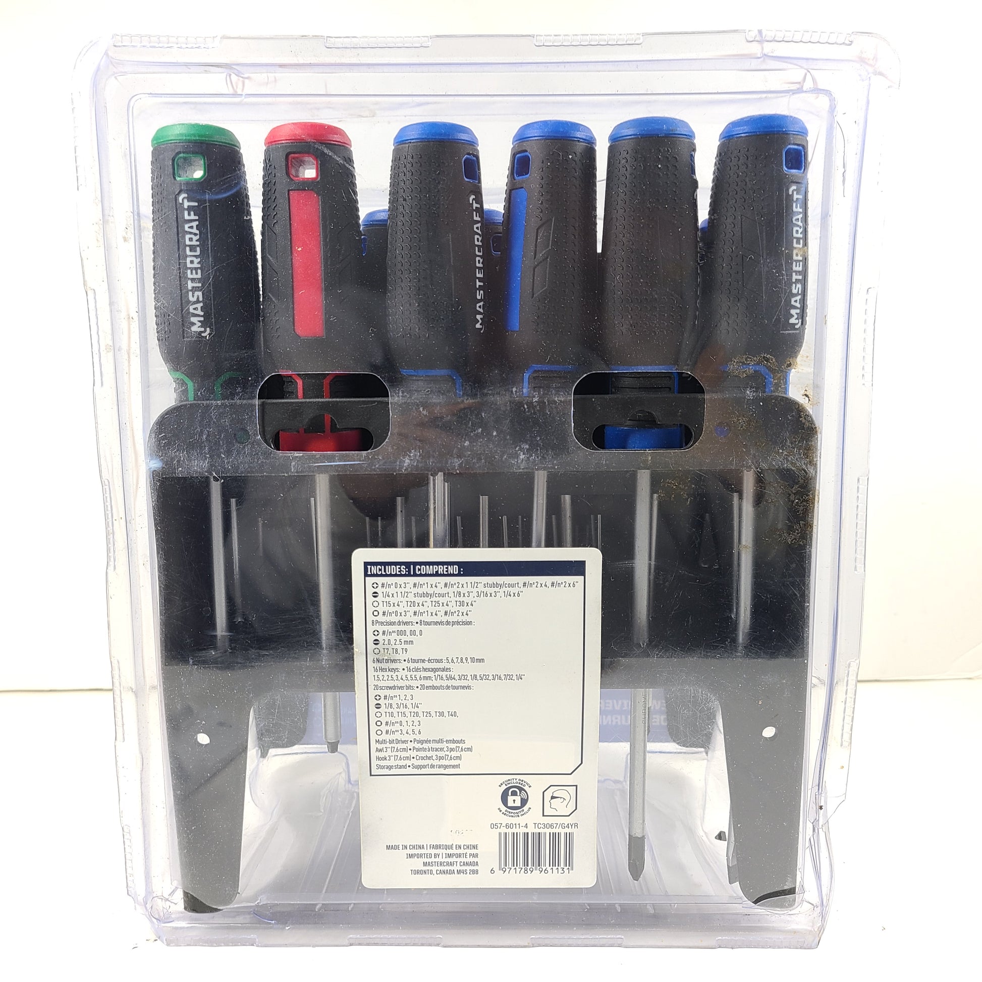 Description: The Mastercraft Screwdriver Set is designed to keep tools neatly organized for a wide range of projects. It includes a variety of screwdrivers, driver bits, and hex keys for versatile use, all neatly stored on the included stand.