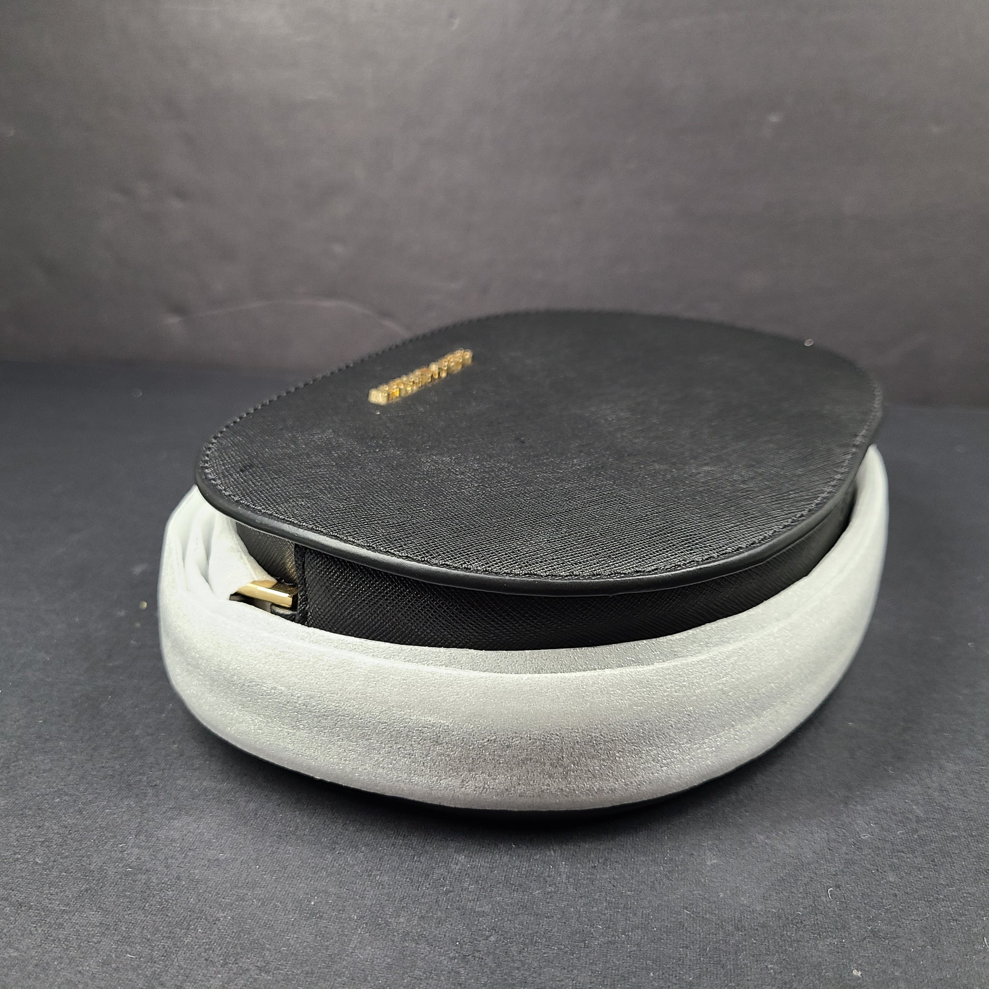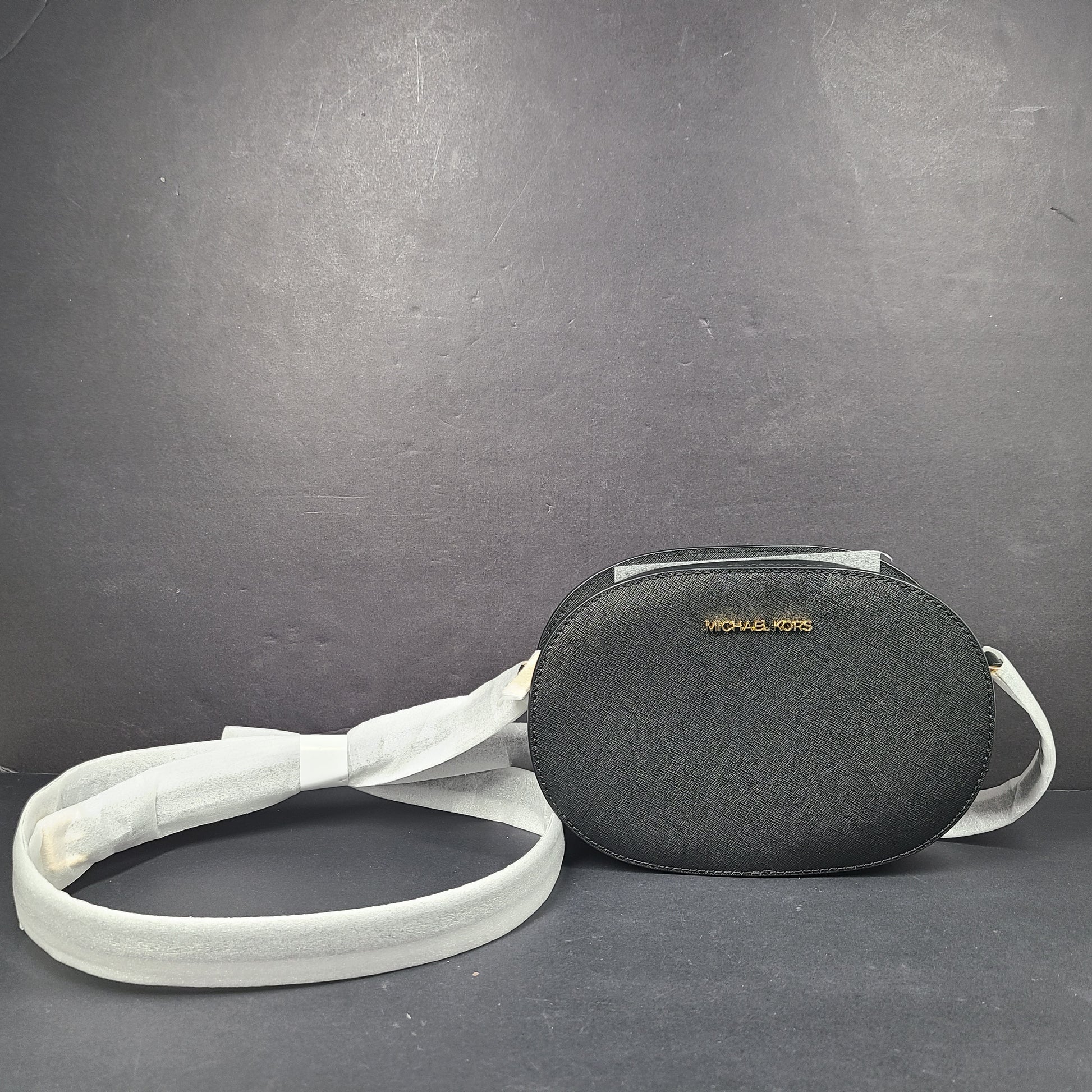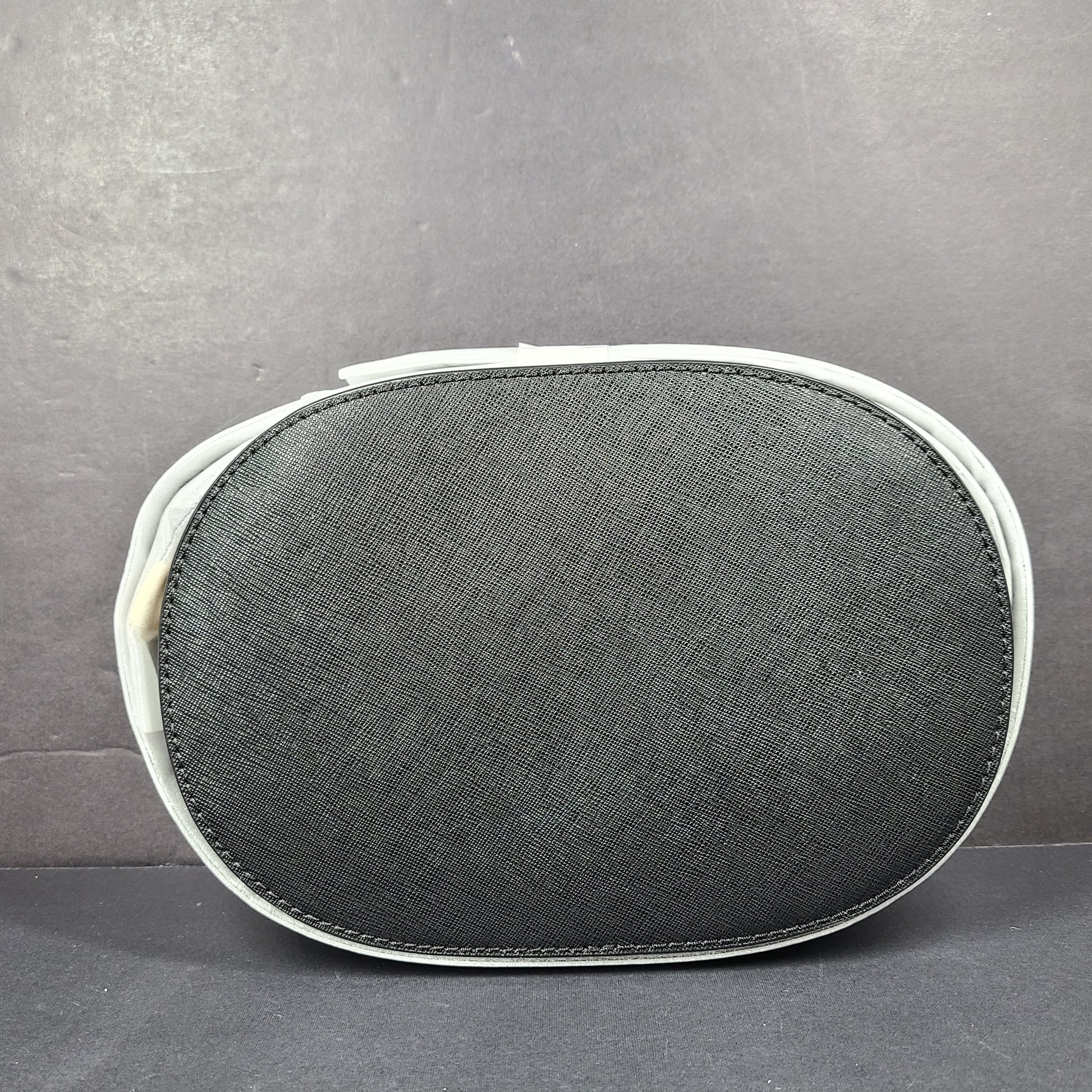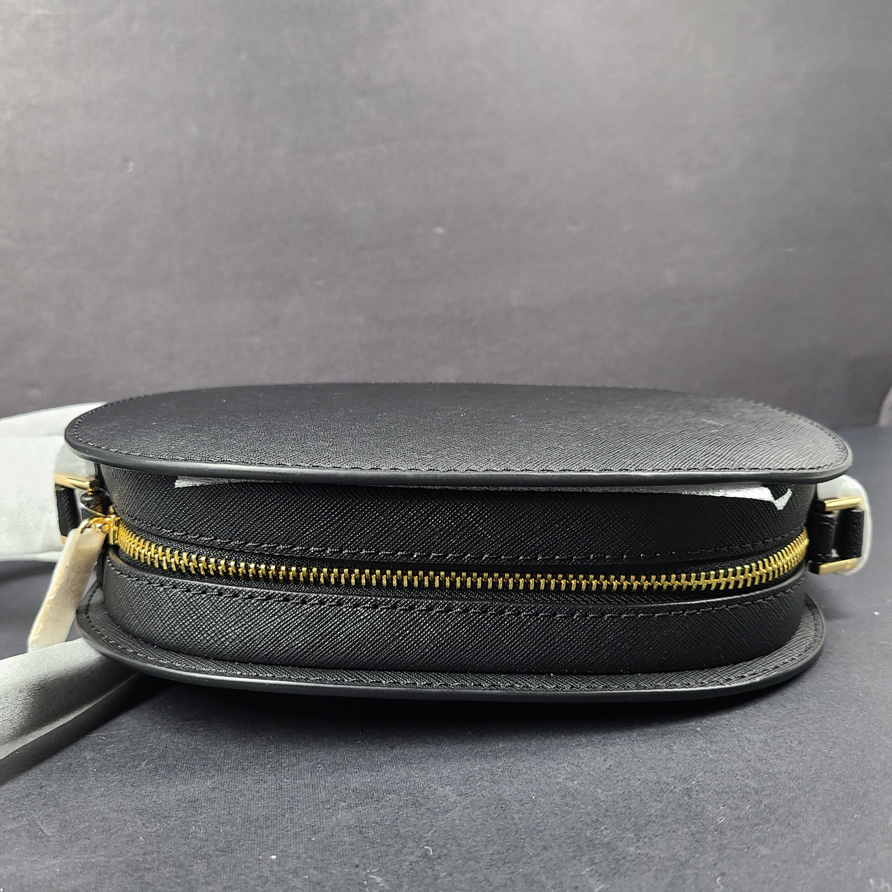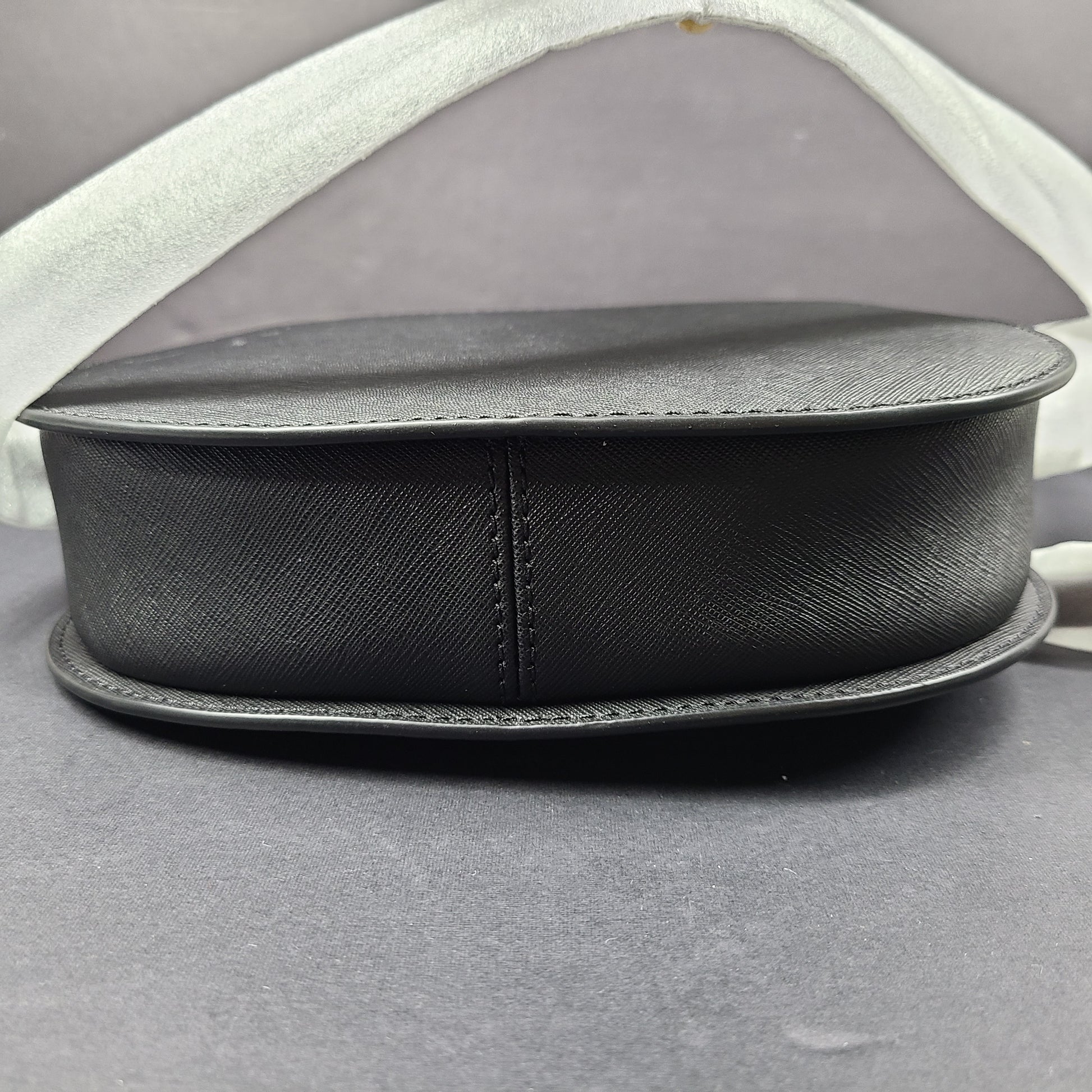 Description: This compact crossbody is crafted from Saffiano leather, known for its structured texture, durability, and elegant finish. It features a slim, adjustable leather strap and a geometric oval silhouette.