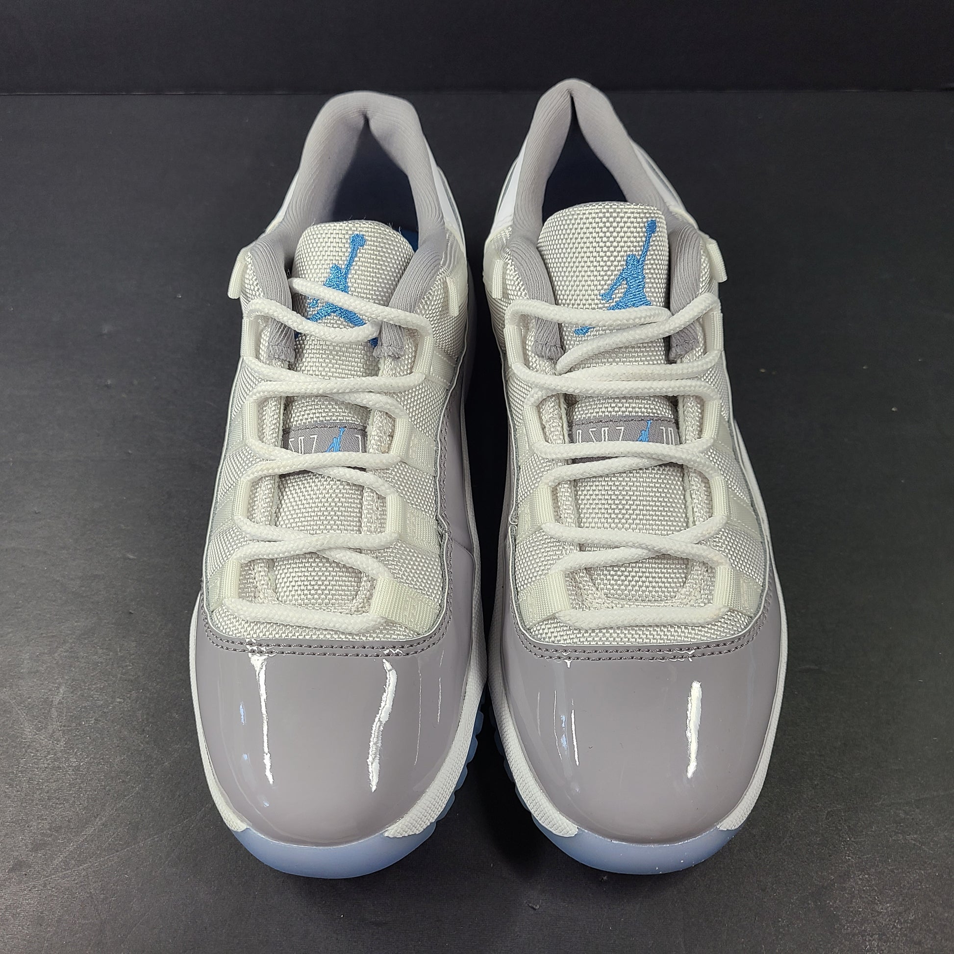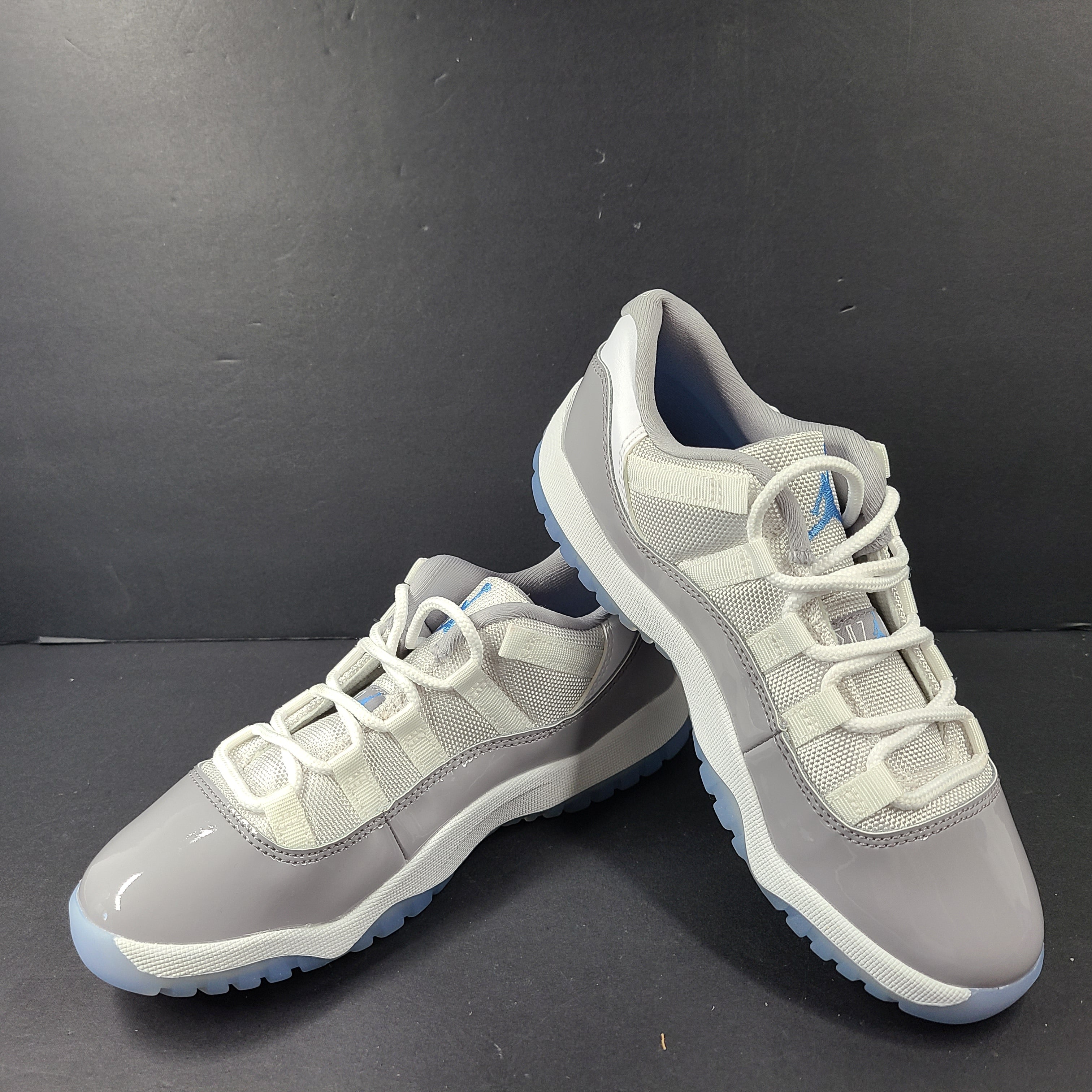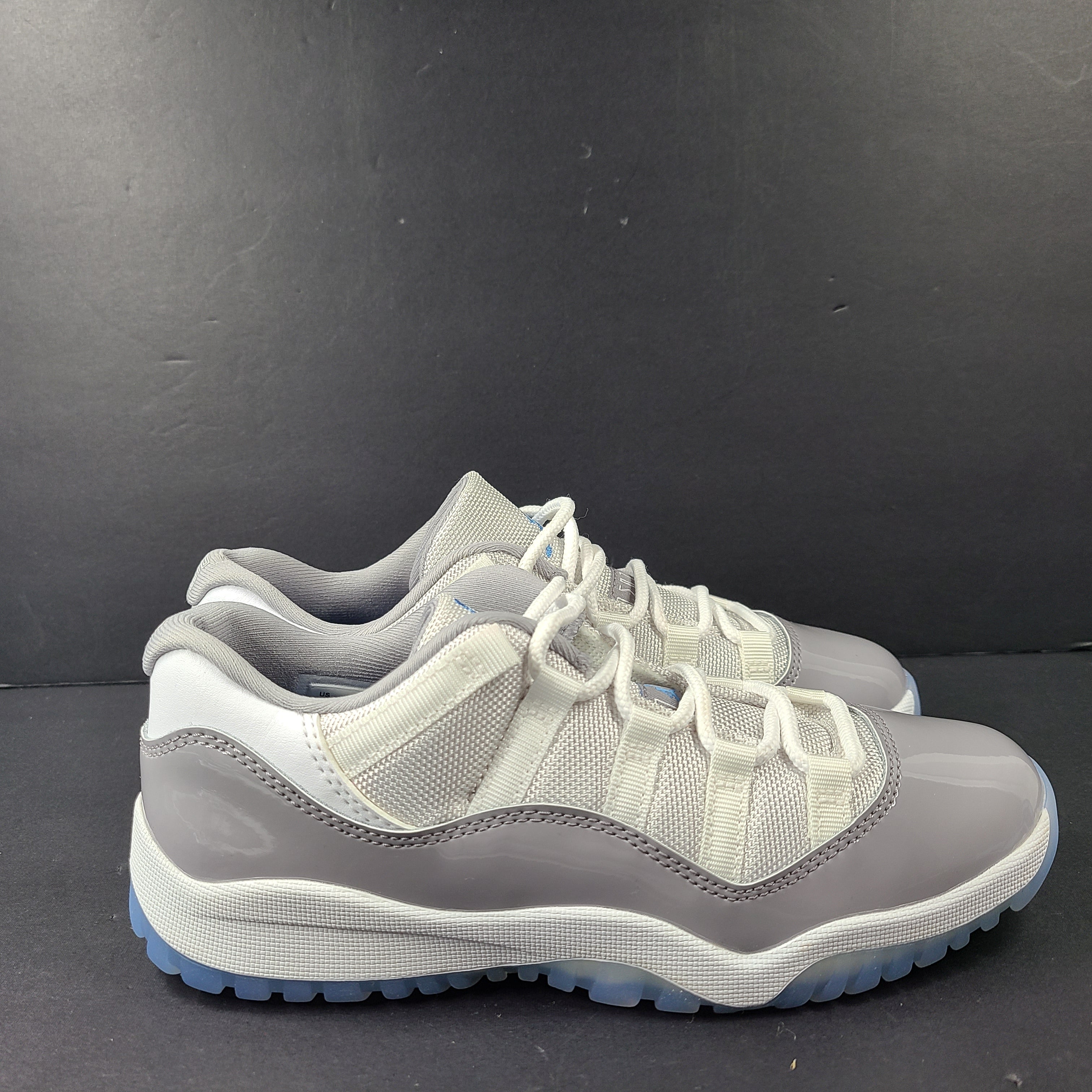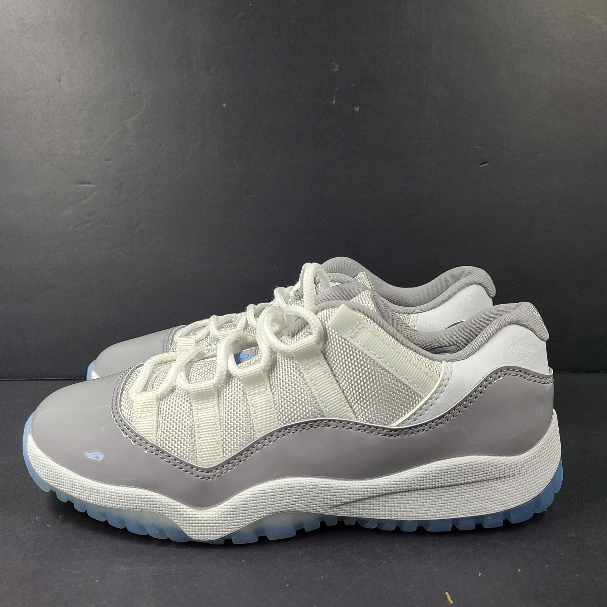 Upper: White ballistic mesh provides a lightweight and breathable foundation, complemented by a patent leather mudguard in soft Cement Grey for structure and classic AJ11 styling.