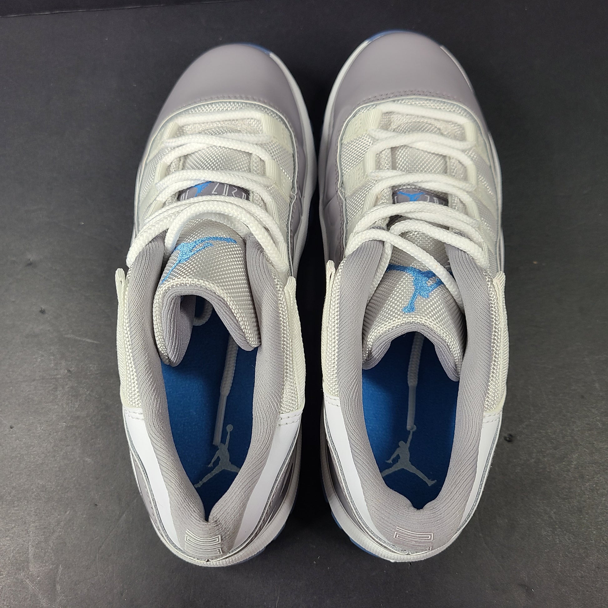 Branding: Subtle pops of University Blue Jumpman logos appear on the tongue and heel, adding a fresh, recognizable contrast to the muted palette.