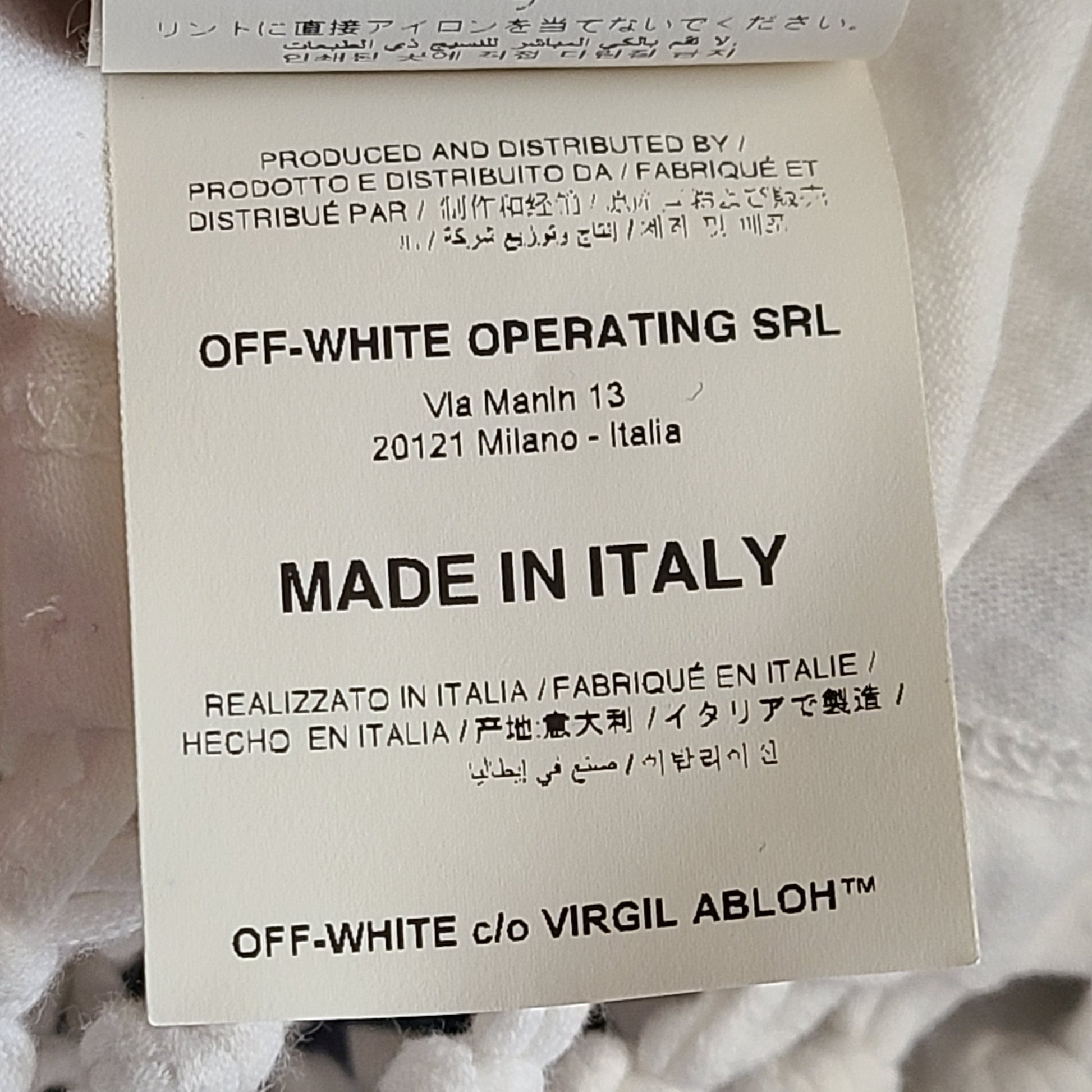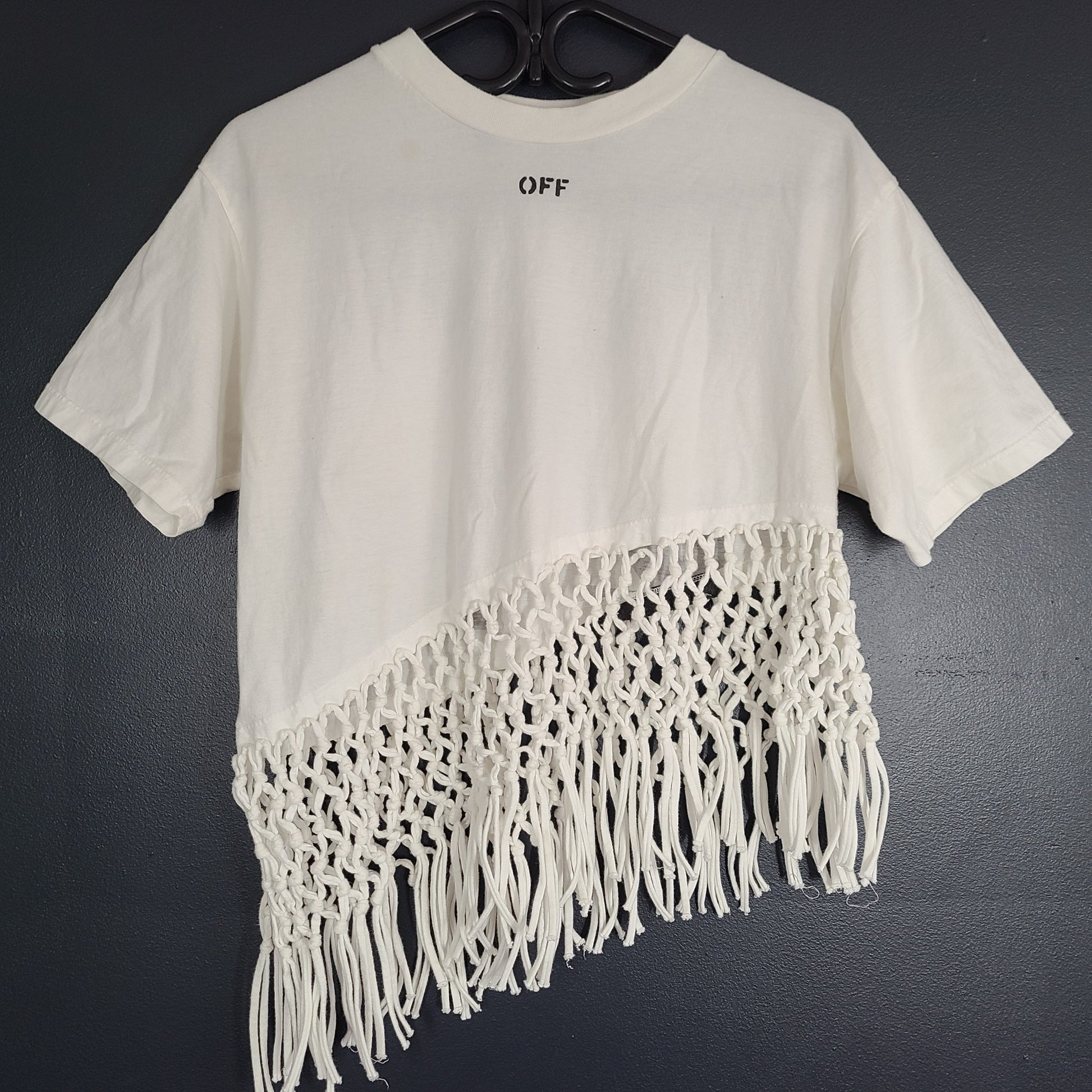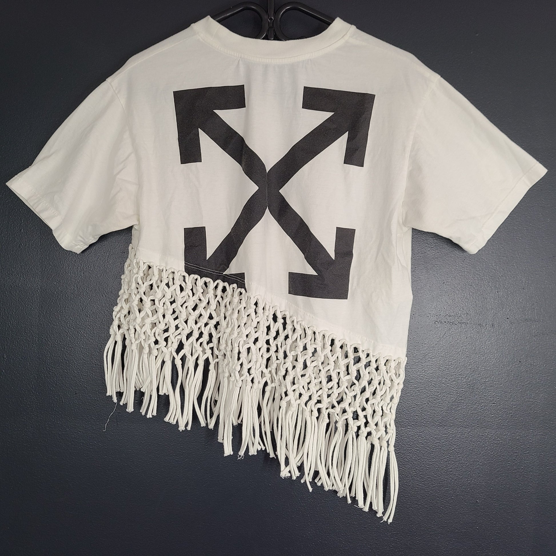 Introducing the Off-White Asymmetric Arrows Fringe T-shirt, a bold and stylish statement piece.