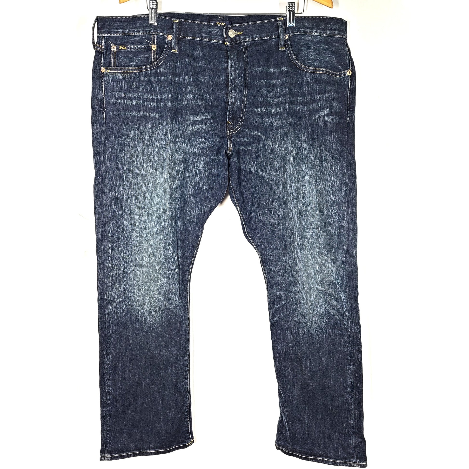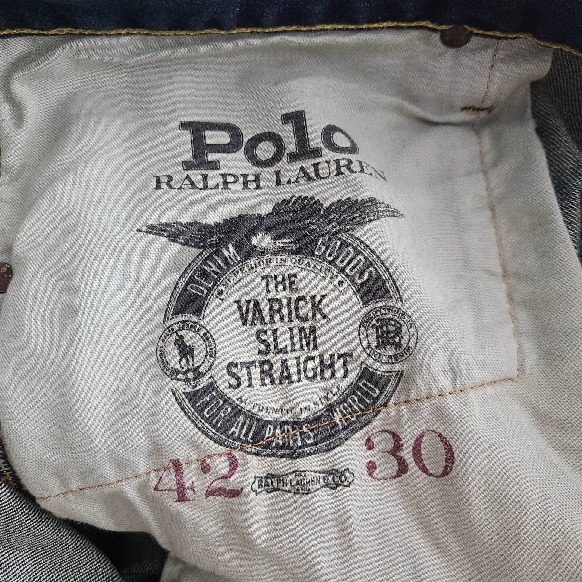 Five-pocket styling with signature metal rivets. “Polo” label at the coin pocket.
