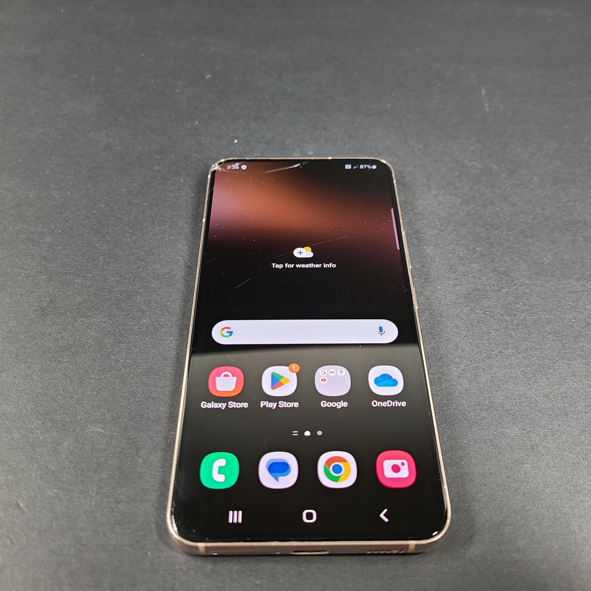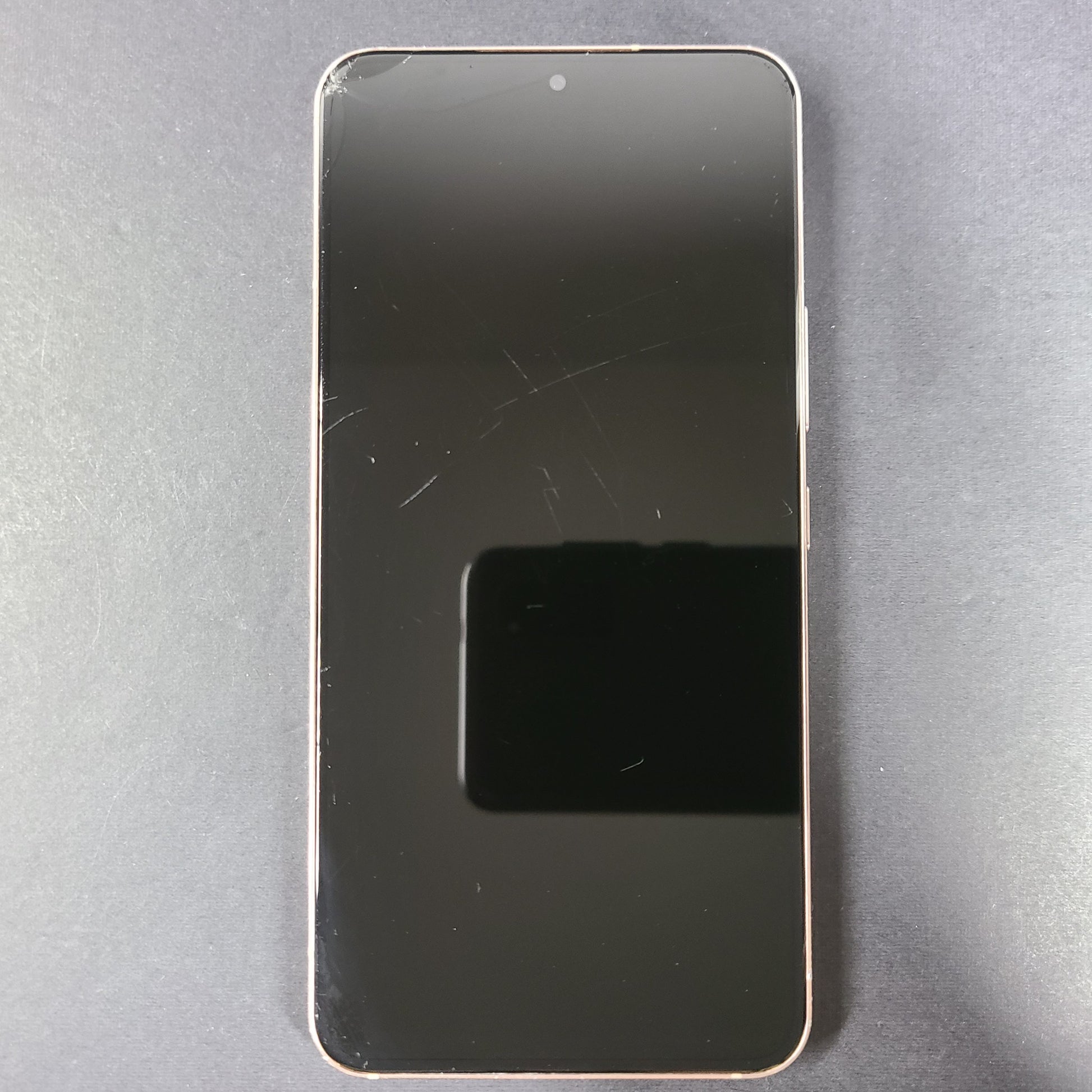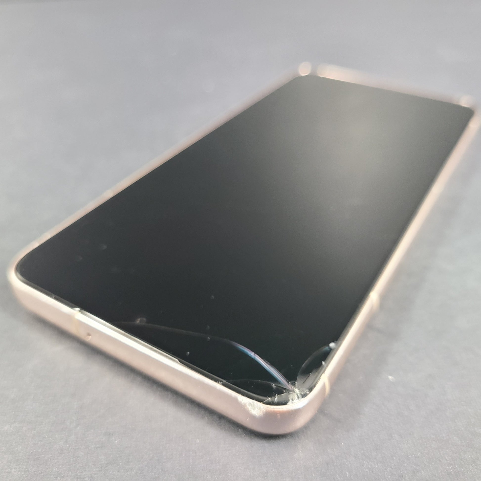 - Screen is cracked in the left corner with some pieces of glass missing.