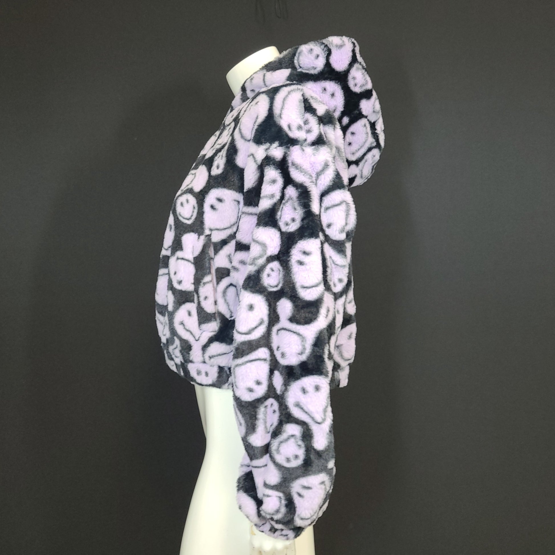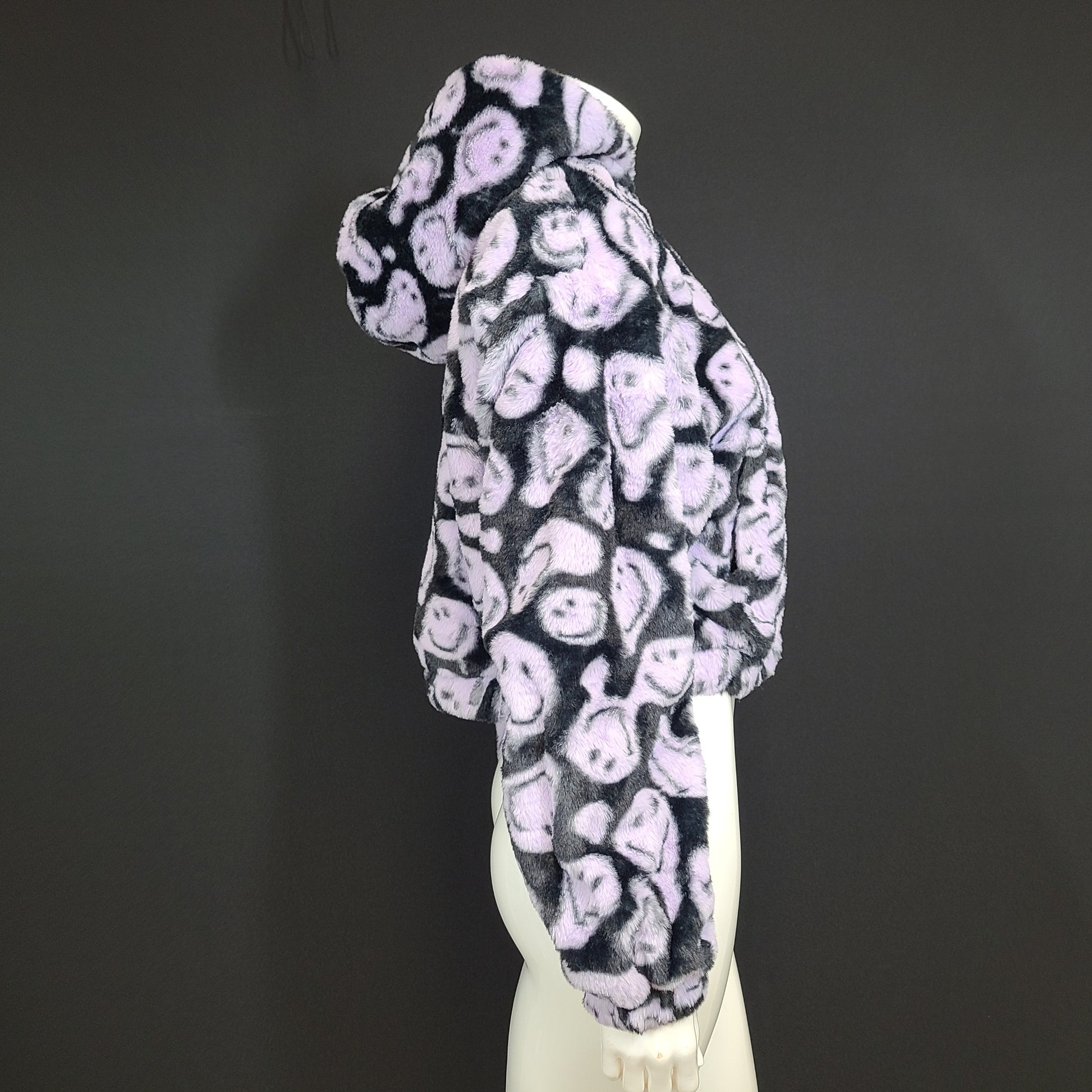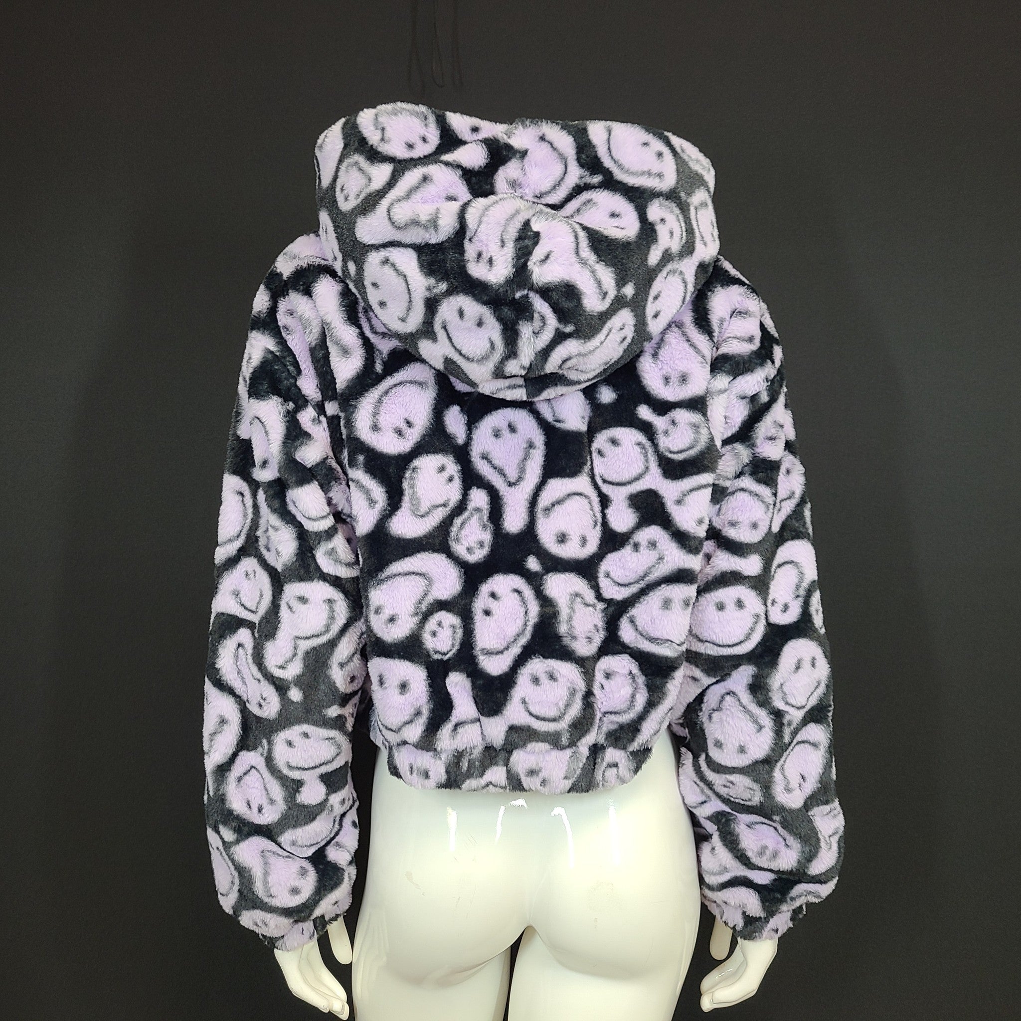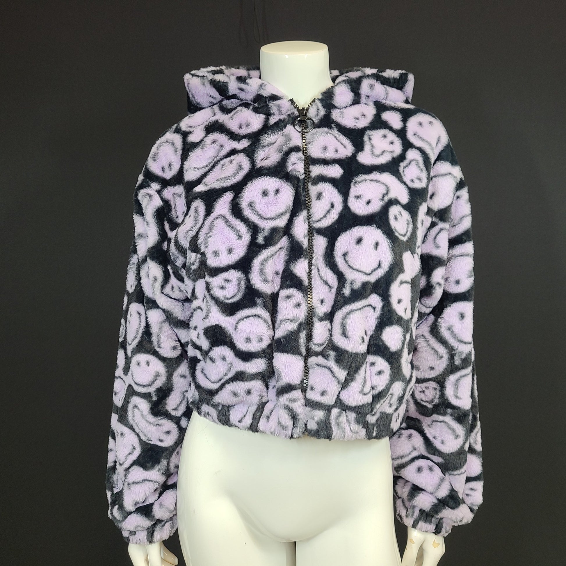 Smiley x H&M Oversized Faux Fur Jacket Cropped Black Purple Fluffy Hooded Sz S
