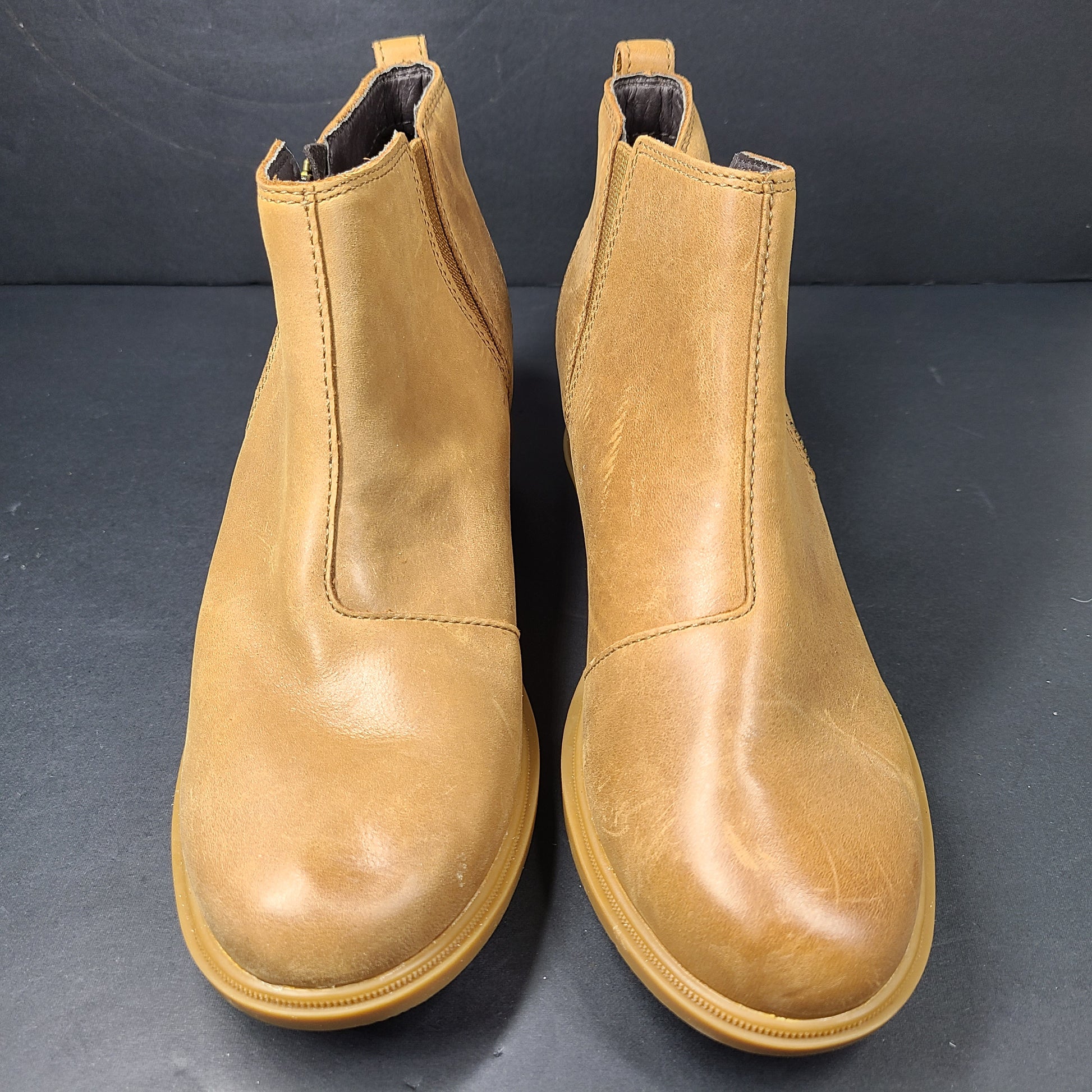 - Tan color with a sleek Chelsea boot style