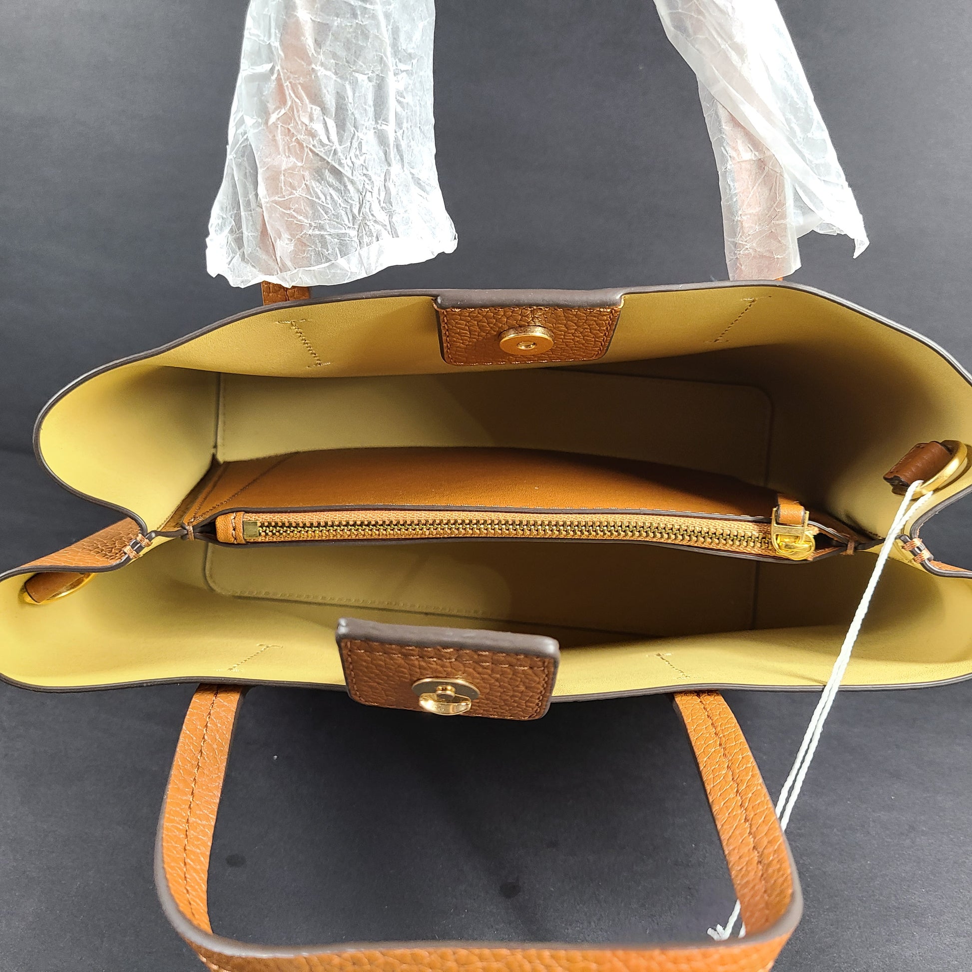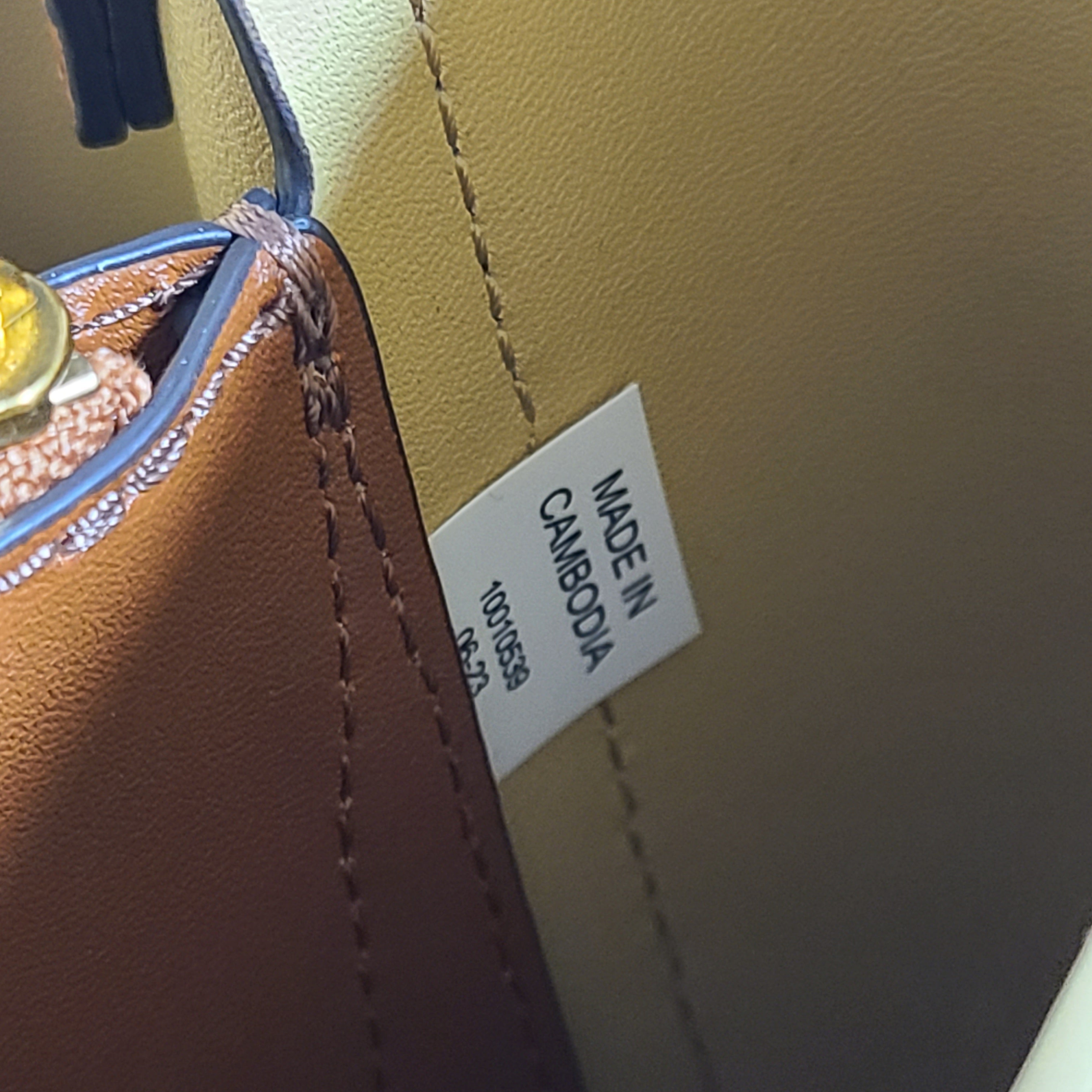 Hardware: Gold-tone Metal hardware, logo plaques, D-rings, zippers.